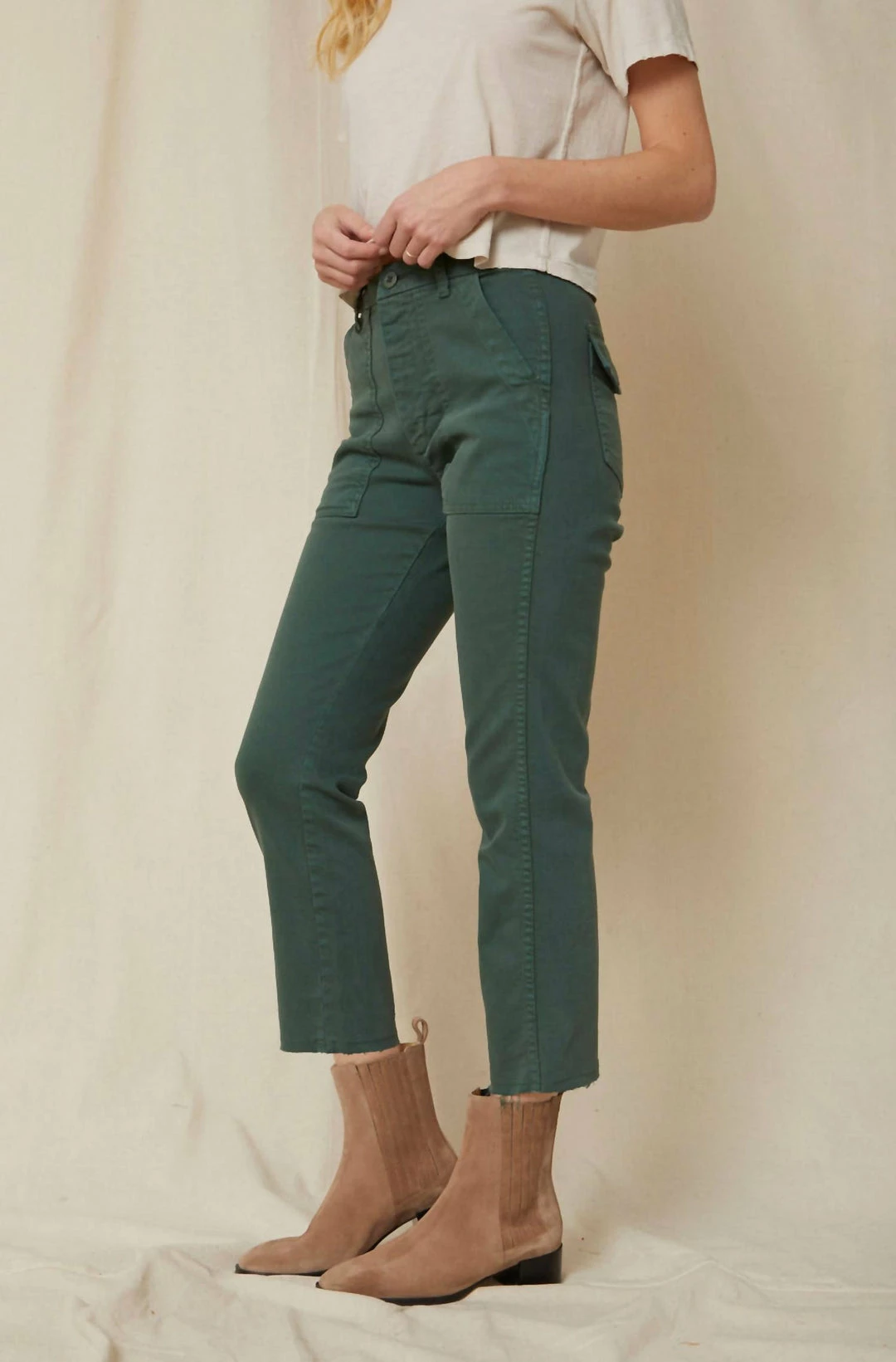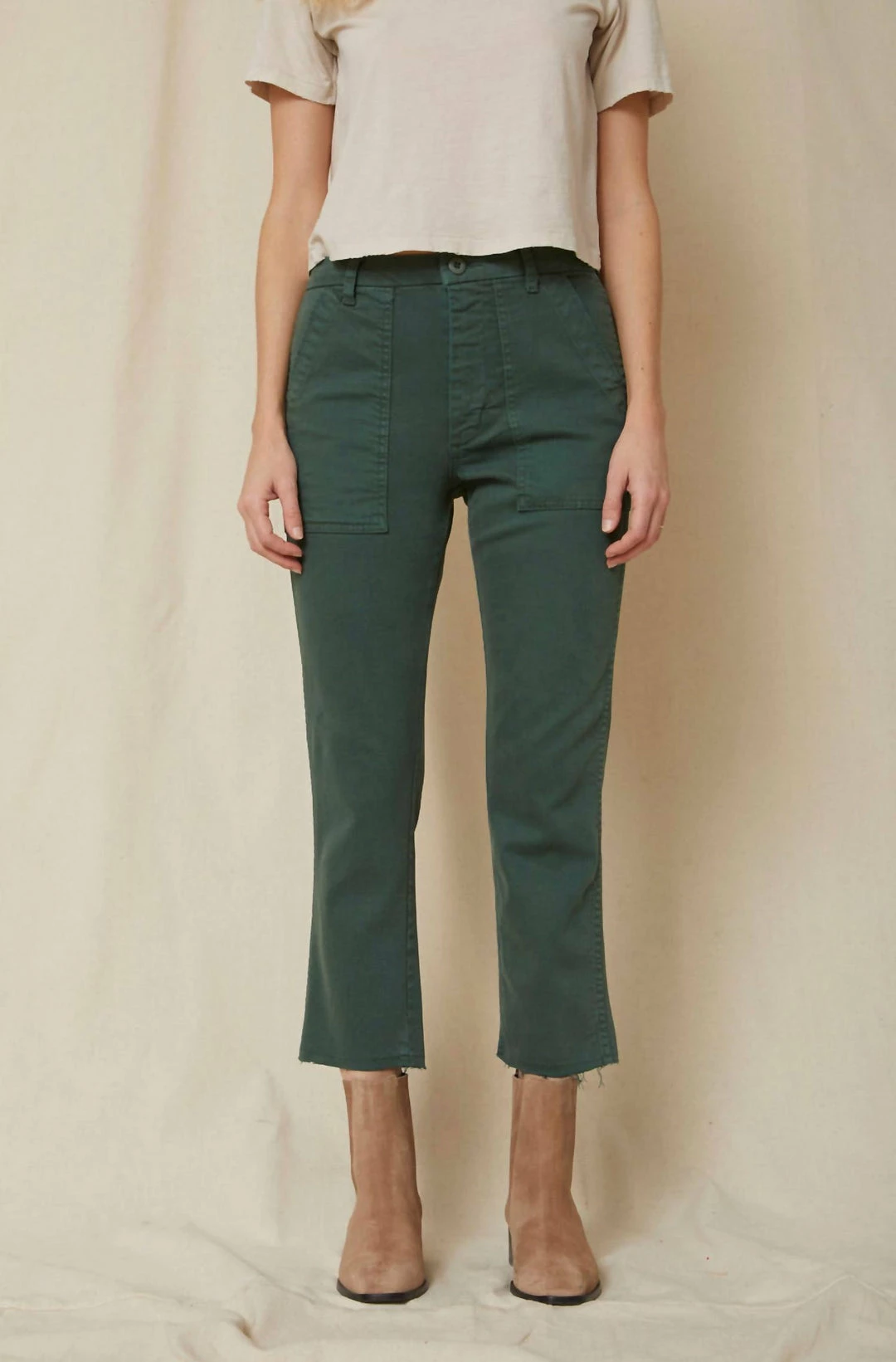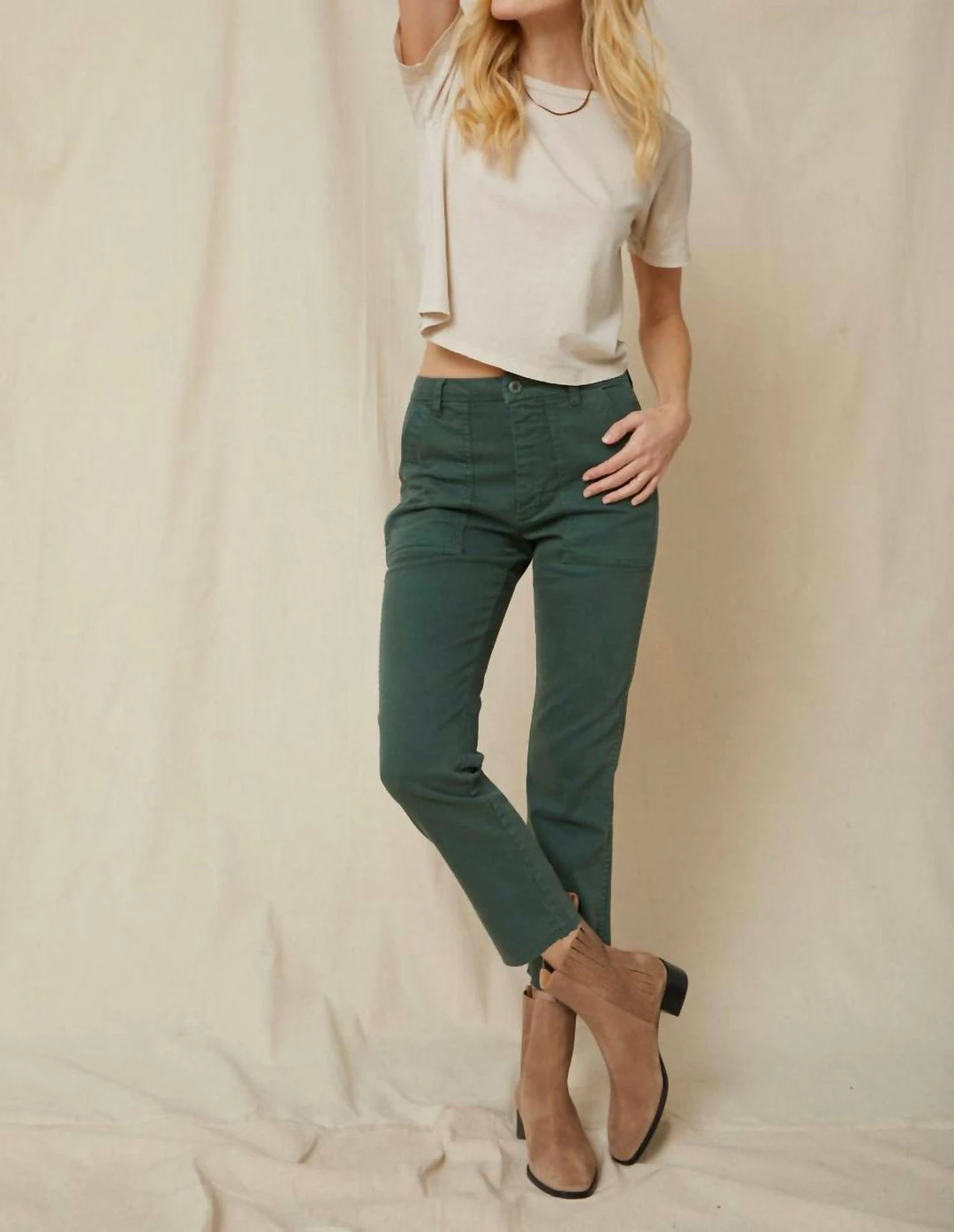 The EASY ARMY TROUSER is a slightly relaxed, crop straight pant with trouser styling and a single button with zip fly enclosure. Features back and front army patch style pockets. Just like its name, it’s meant to feel easy to wear and effortless to style. WASH –  EVERGREENFIT & MEASUREMENTS –  Inseam = 25 1/2″Front Rise = 11 1/2″Back Rise =15 1/2″Leg Opening = 14 3/4″Measurements taken from size 27Jess is wearing size 26 and is 5’7″Fabric & Care –   Machine wash cold, and either hang dry or tumble dry low heatMade with love in Los Angeles