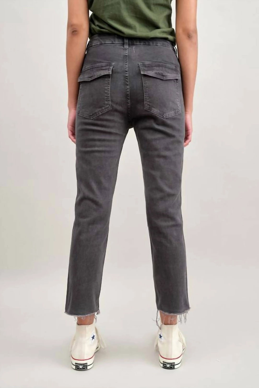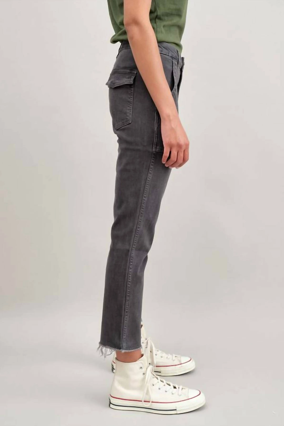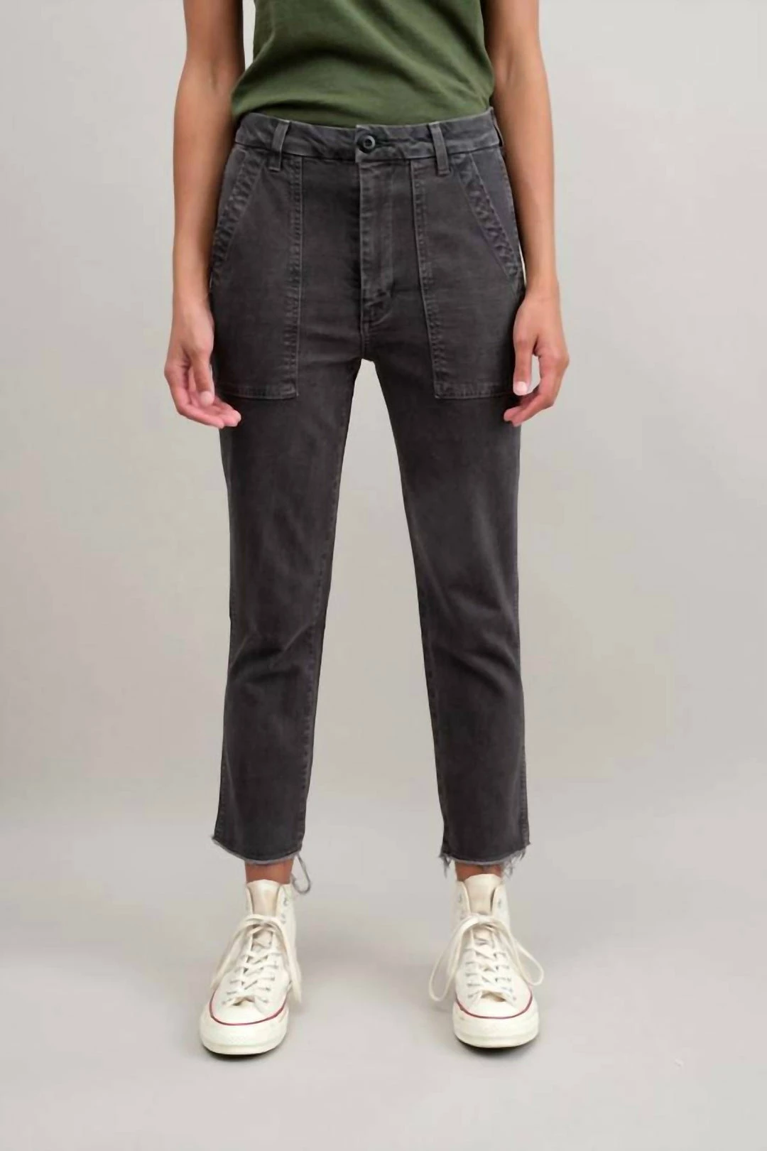 The EASY ARMY TROUSER is a slightly relaxed, crop straight pant with trouser styling and a single button with zip fly enclosure. Features back and front army patch style pockets. Just like its name, it’s meant to feel easy to wear and effortless to style. FIT & MEASUREMENTS –  Inseam = 25 1/2″Front Rise = 11 1/2″Back Rise =15 1/2″Leg Opening = 14 3/4″Measurements taken from size 27Lauren is wearing size 25 and is 5’8″