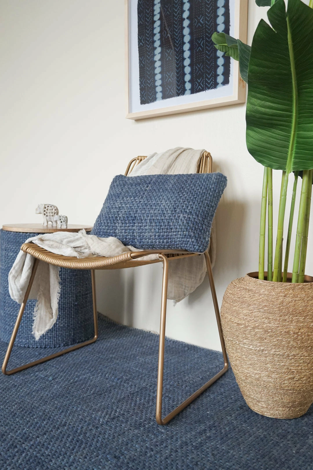 The Handwoven Luxe Indigo Rug features a versatile and durable woven pattern that can be styled with any piece in the collection.