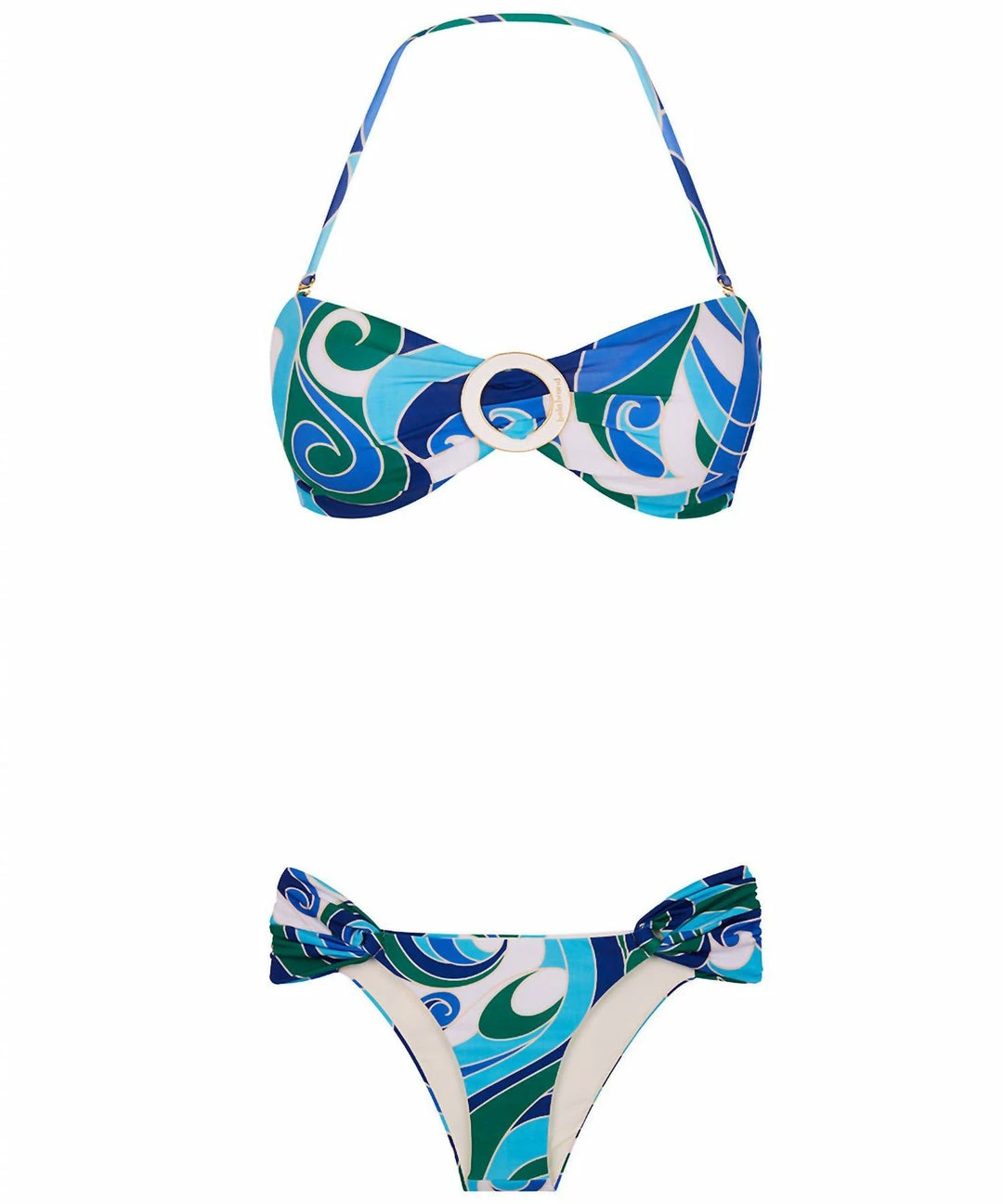 Vicky Bikini set. Beachy bandeau top, comfy and low-rise bottom and lots of style! Ties behind the back;Removable halter straps;Ties behind the back;Bottom ties at side;Colors and patterns may vary slightly from photo;Golden & white enamel embellishments;2-piece set;Modeled in Size S.Sizes Available – From Small to Large