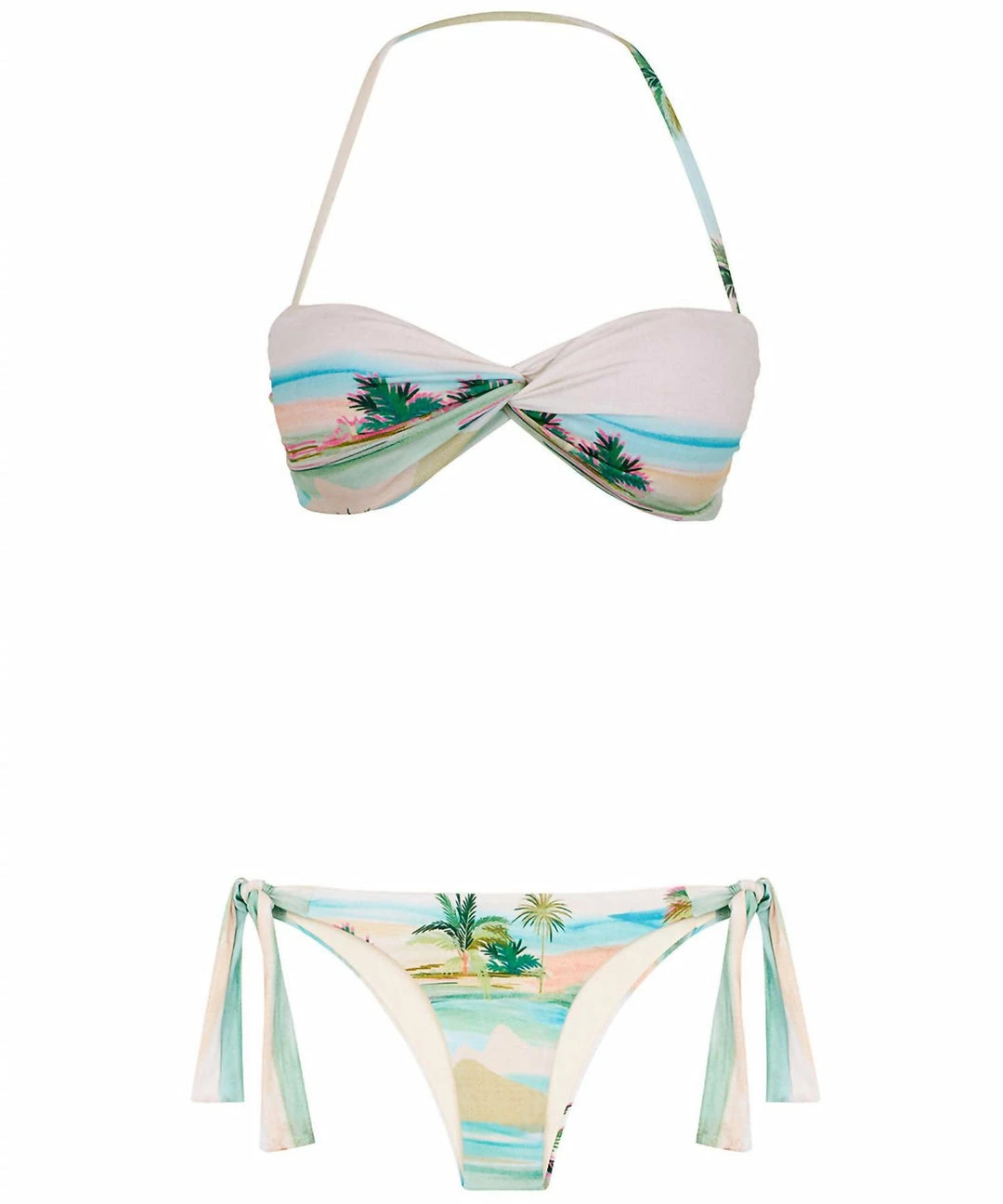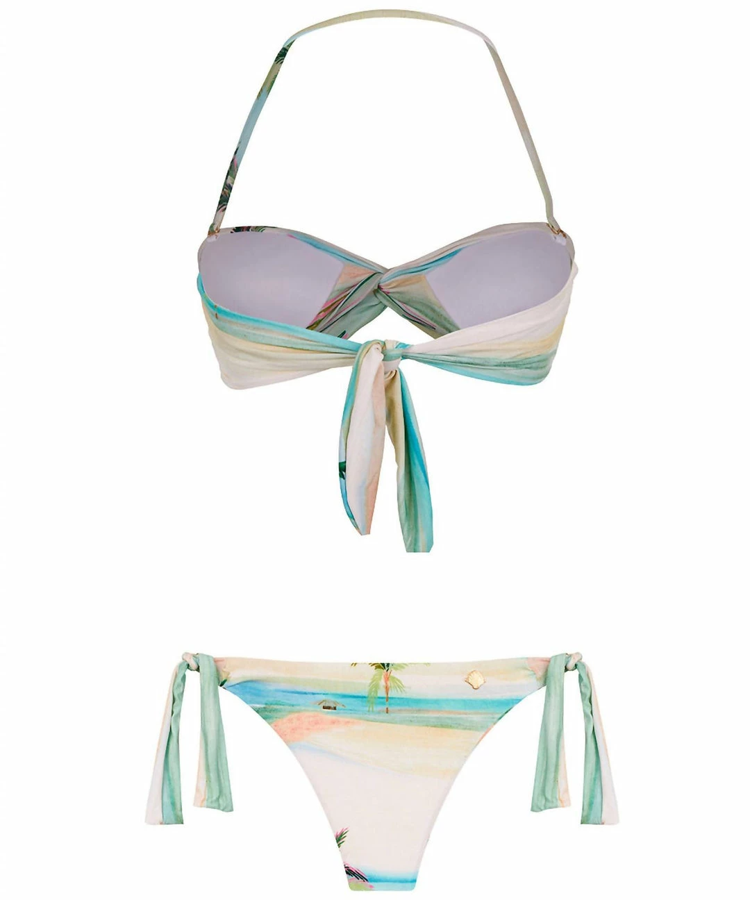 Vicky Bikini set. Beachy bandeau top, comfy and low-rise bottom and lots of style! Ties behind the back;Removable halter straps;Ties behind the back;Bottom ties at side;Colors and patterns may vary slightly from photo;2-piece set;Modeled in Size S.Sizes Available – From Small to Large