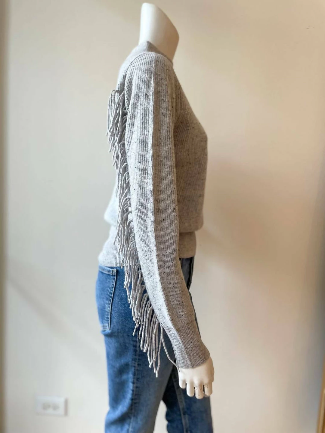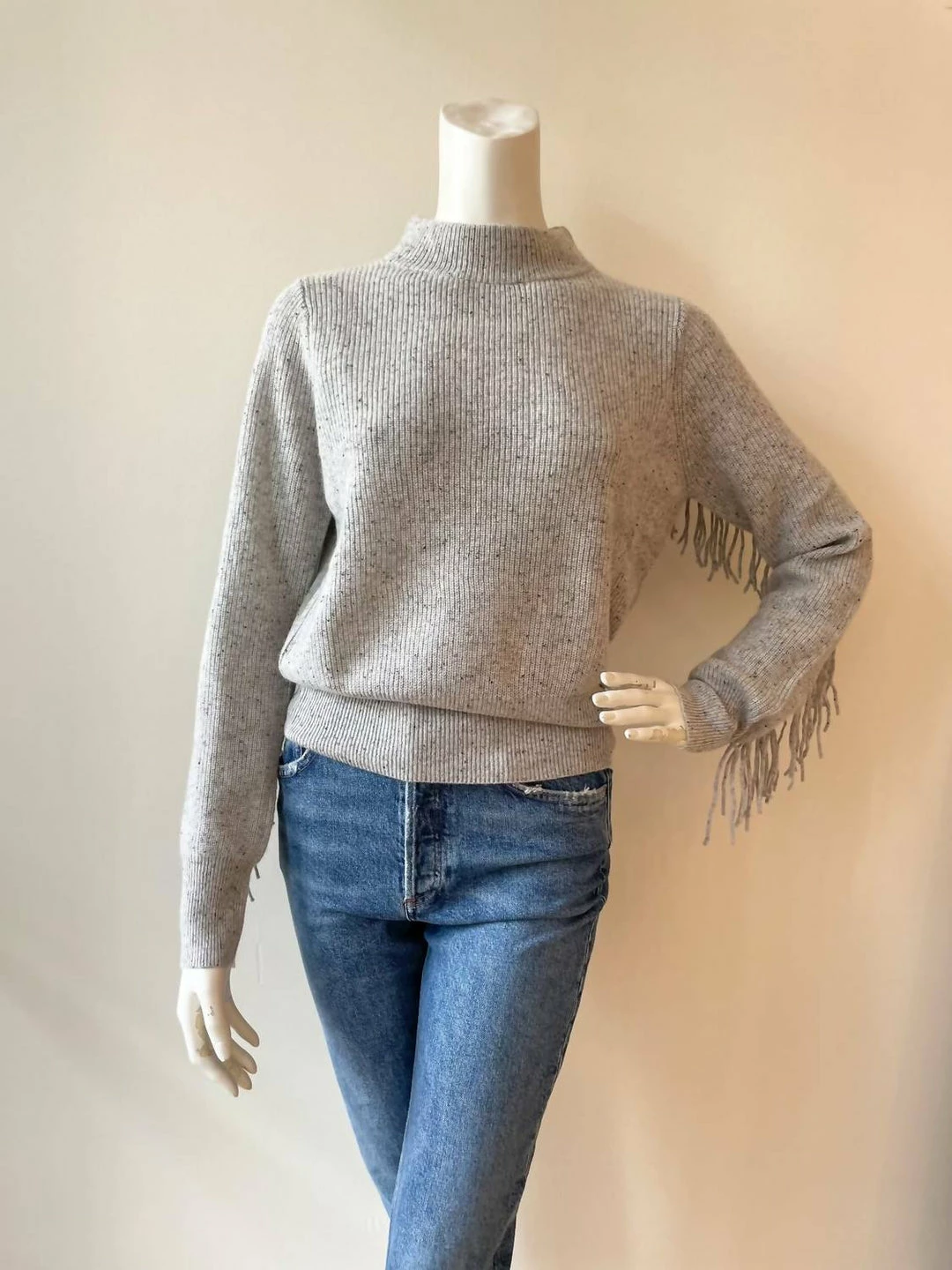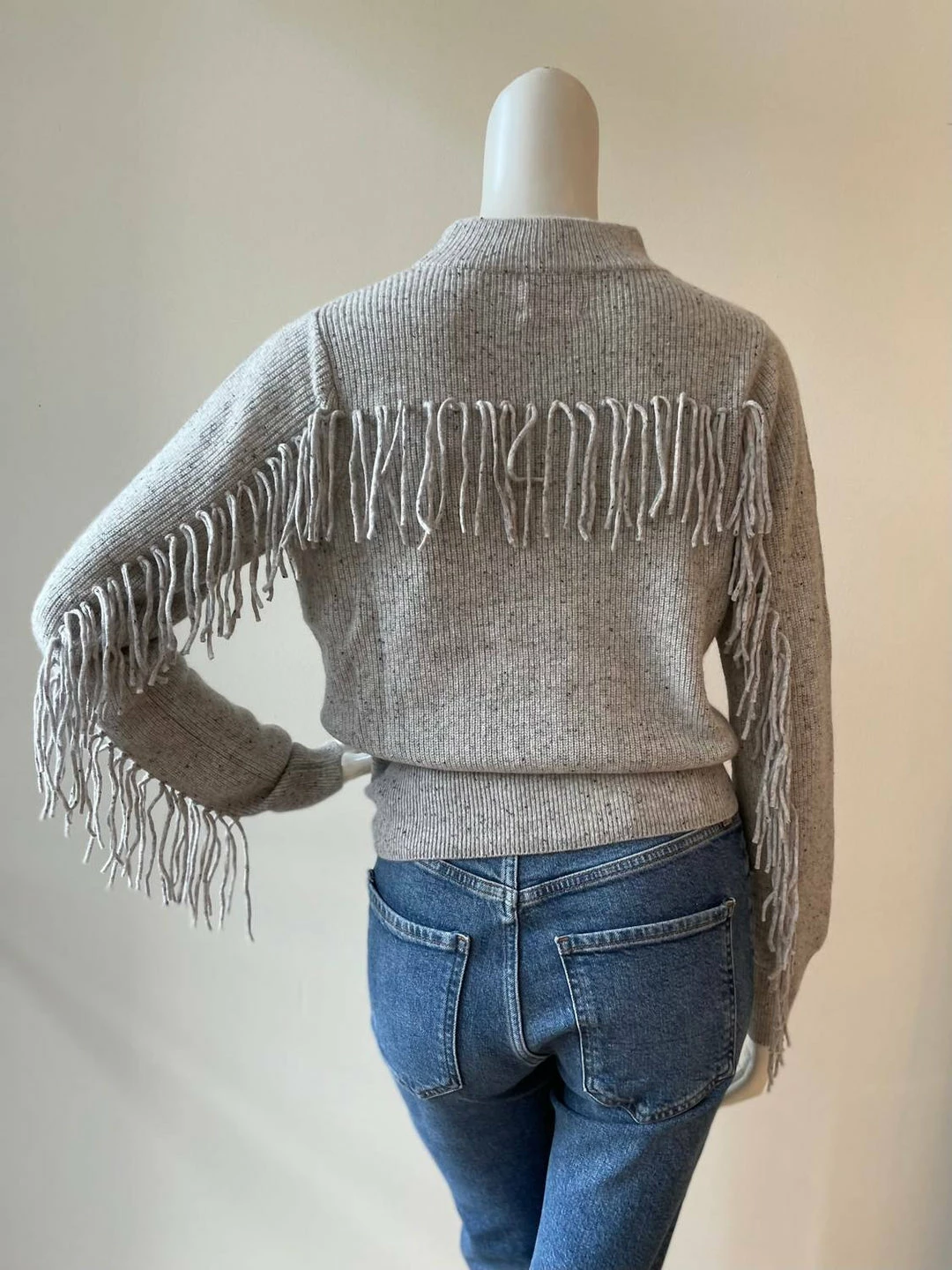 Features a mock neck and fringe along the sleeves and back.