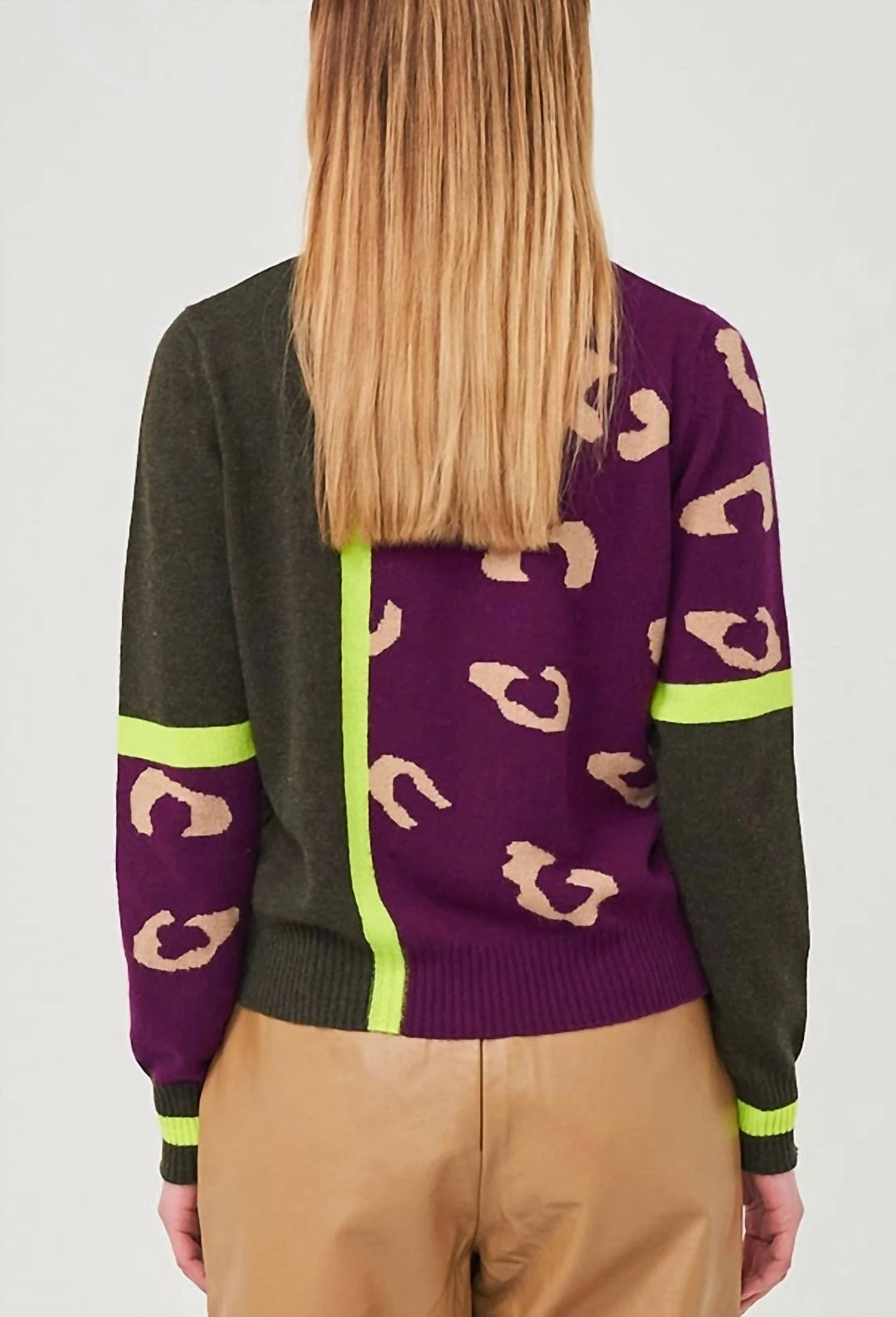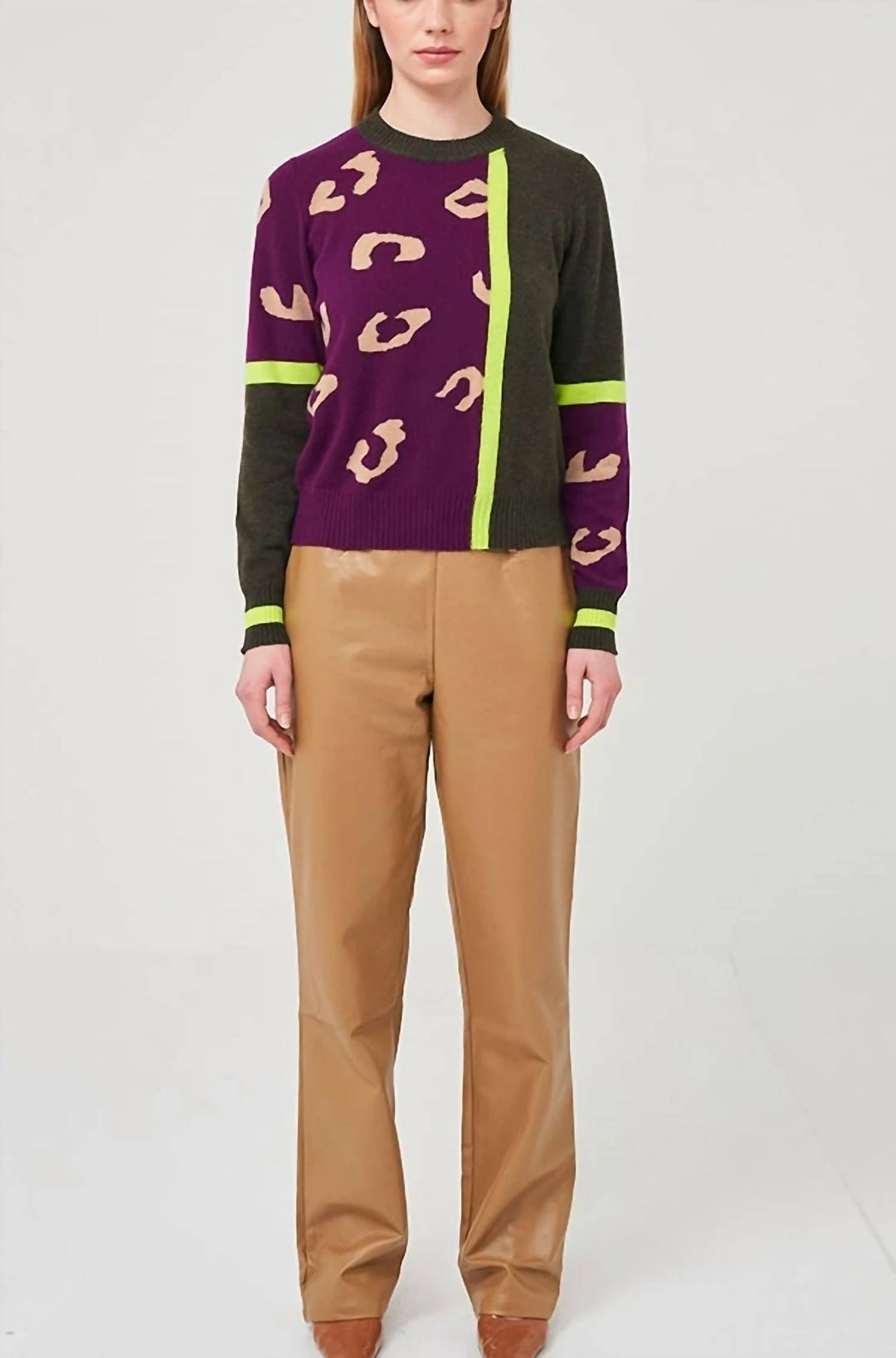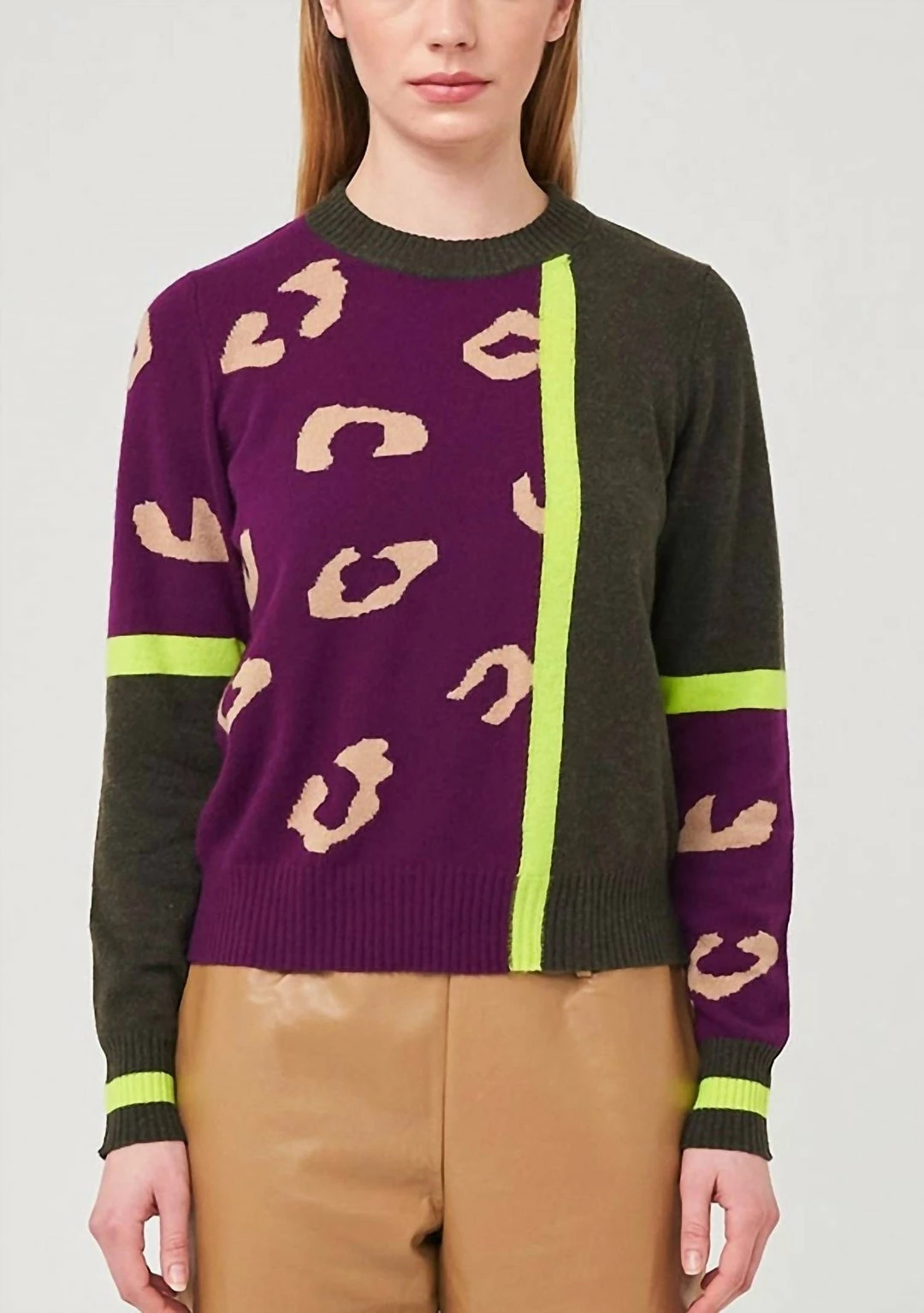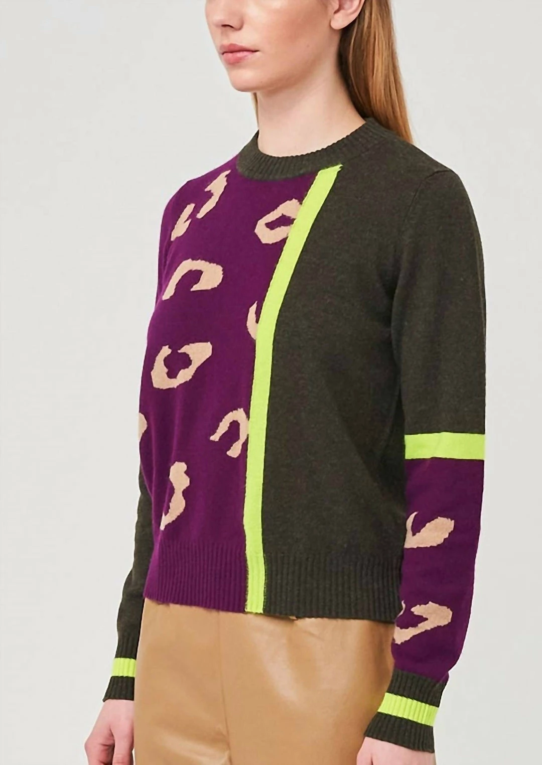 It features a round neckline and full length sleeves. The design is a stunning mix of animal print, block colour and neon stripe detail.