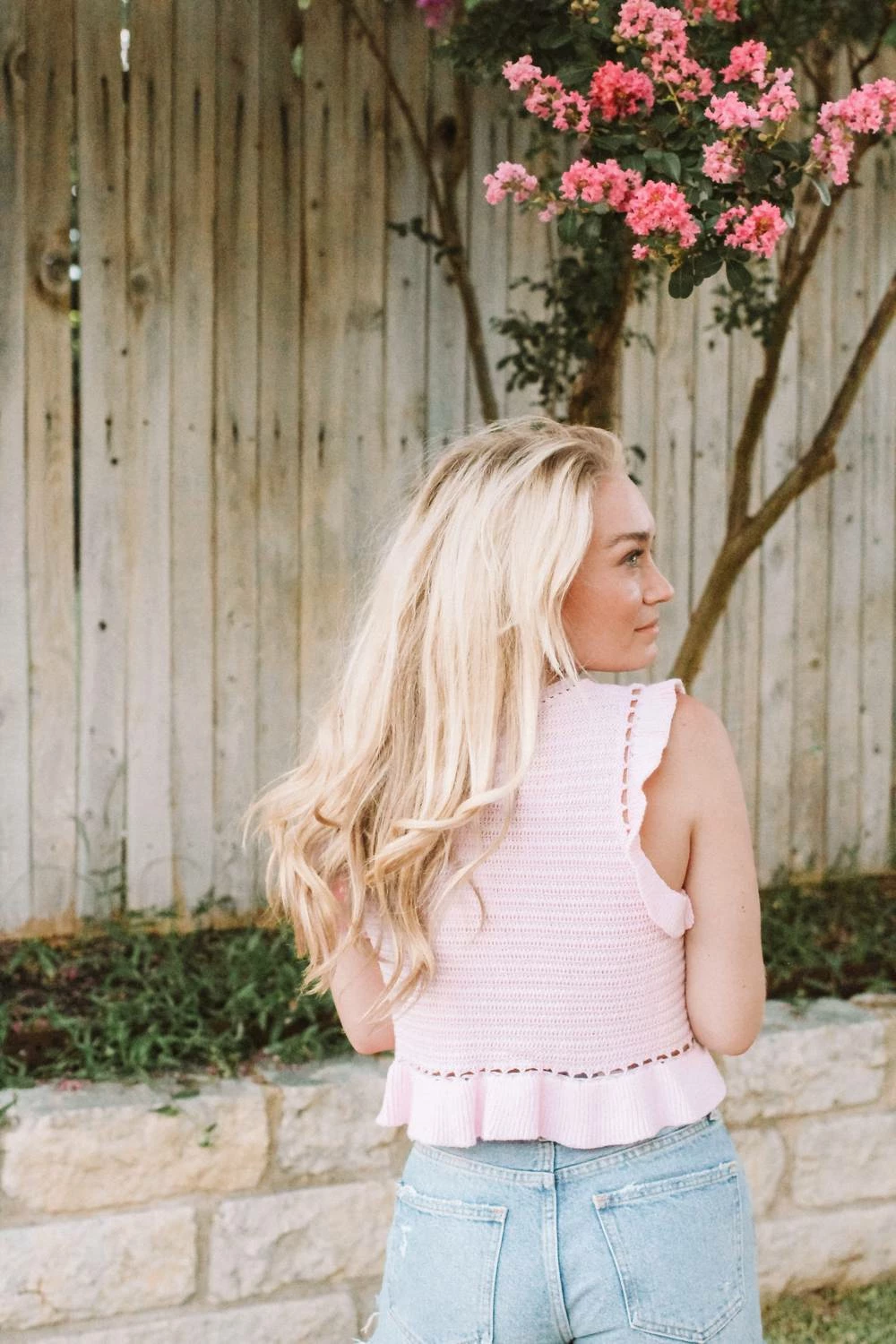 DESCRIPTION. Knit Top. Round neck top. Sleevless with details on sleeves. knit tank with ruffle details . Fits true to size