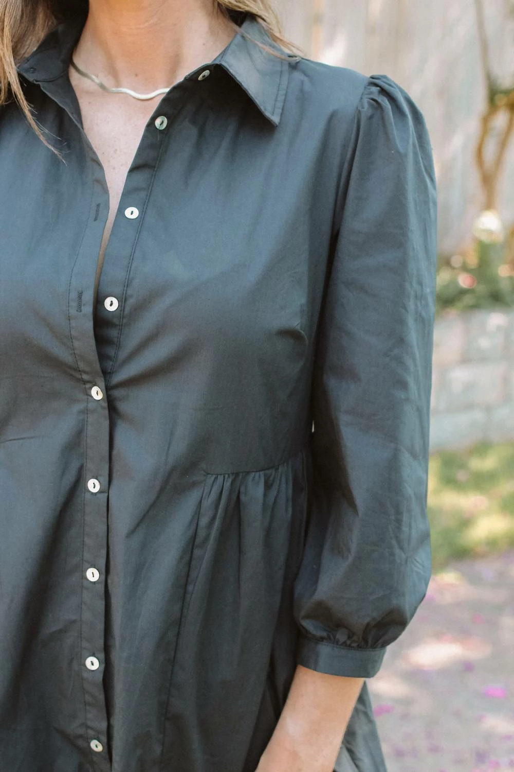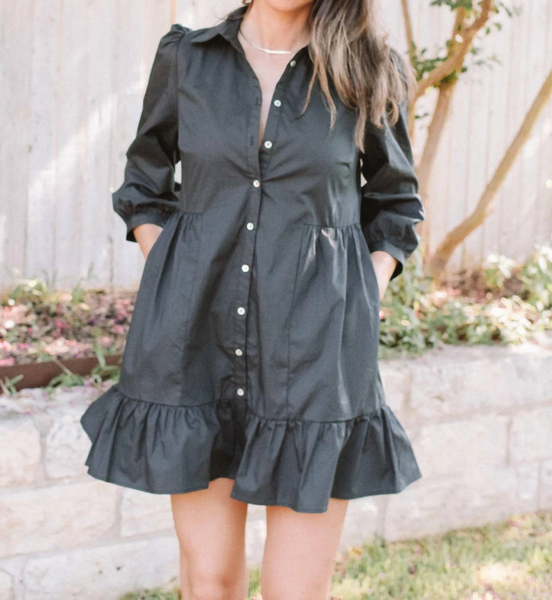 DetailsClassic little dress this collared shirt dress features buttons down the front and a fun and flattering babydoll silhouette.Black poplin cotton shirt dress with ruffle hem Fits true to size, Modeled in size Small