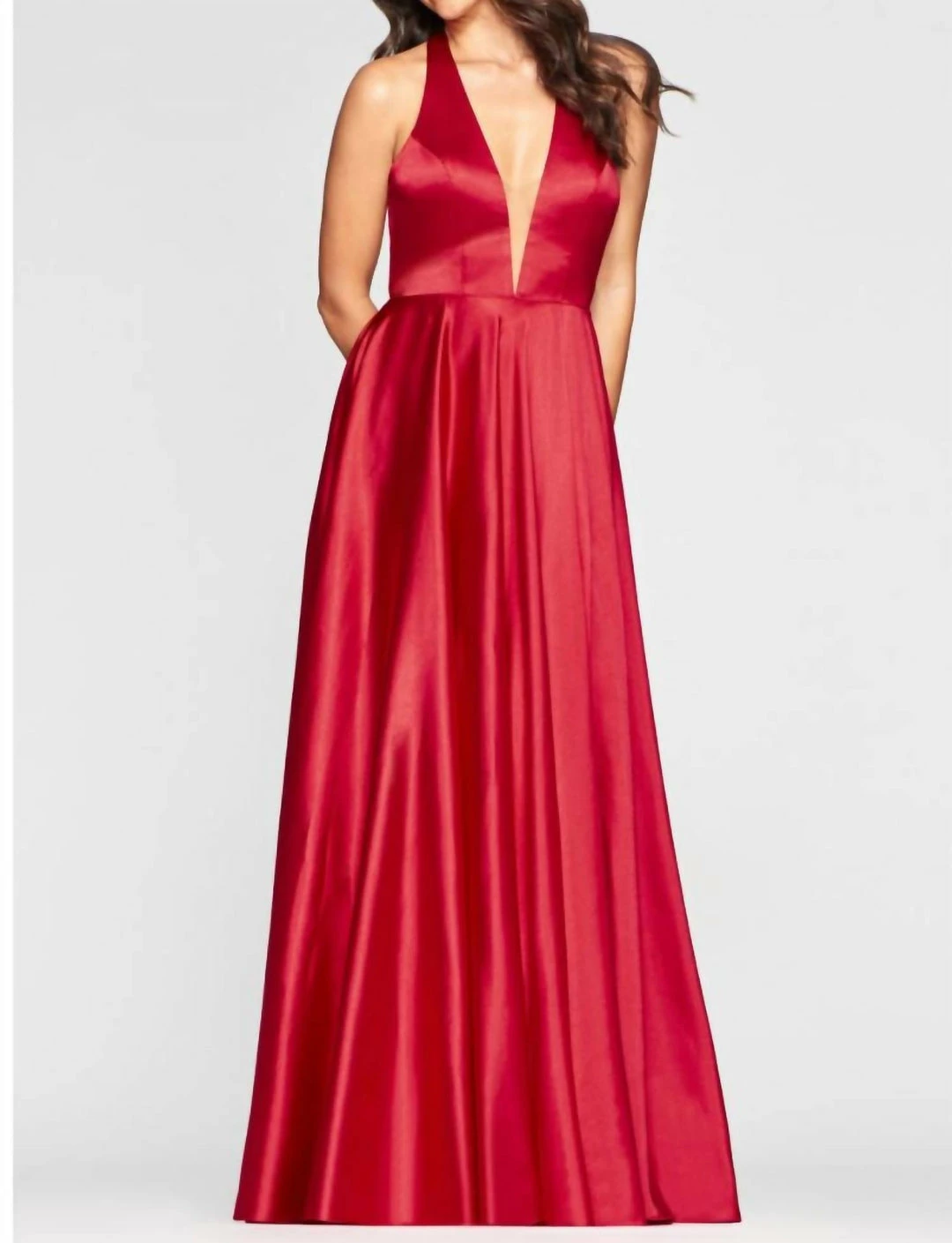 Faviana Style S10403 is a dream! This long charmeuse dress has a plunging v neckline and halter back with waist strap details. The full wrap skirt with slit gives you a pop of leg and is perfect for twirling all night!