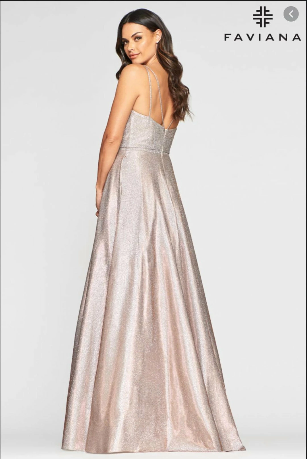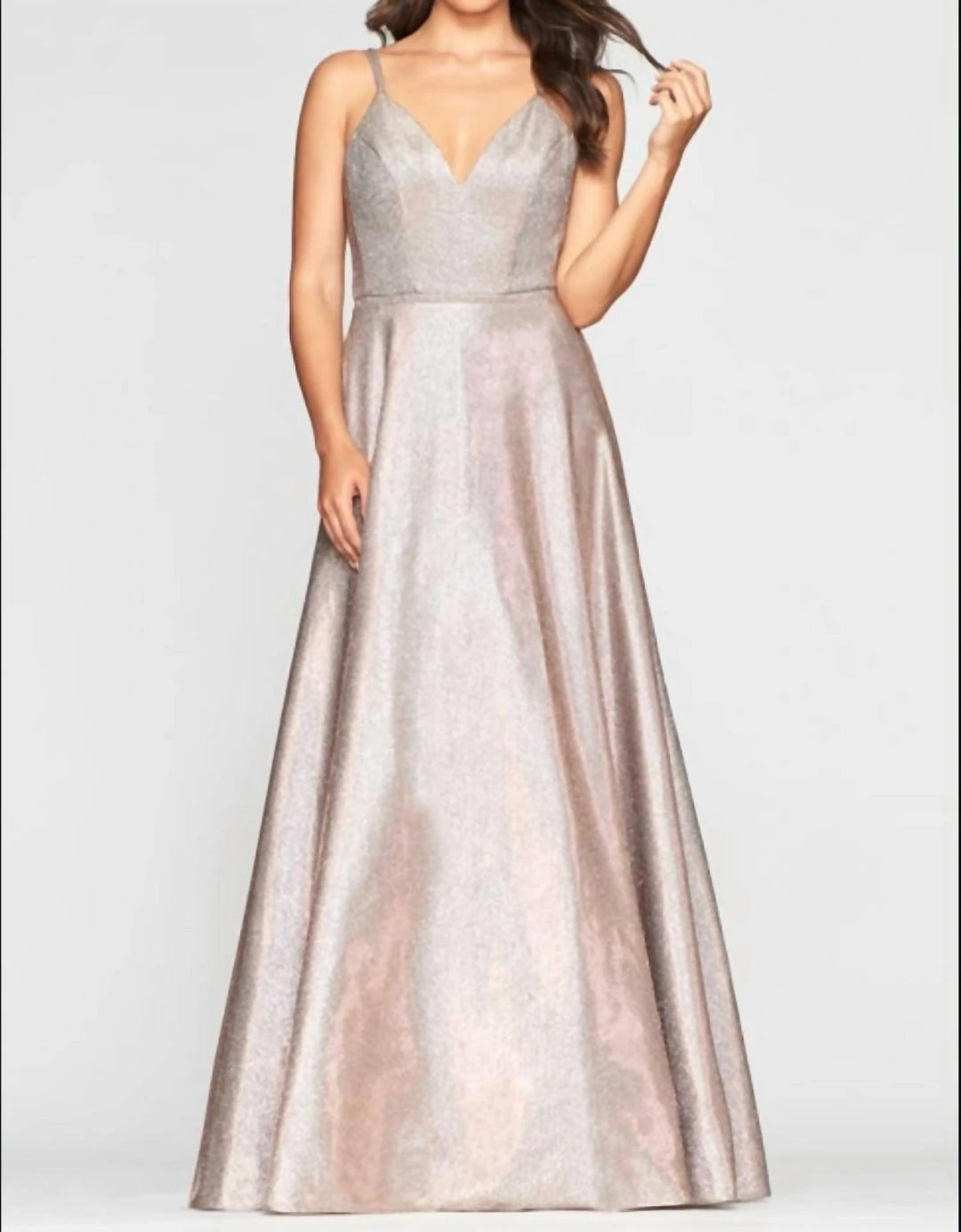 Shimmer the night away in Faviana Style S10424. This sparkly favorite is a long metallic jersey v-neck dress with double shoulder straps and a full skirt. Wear this eye catching dress to your next event and stun the crowd!