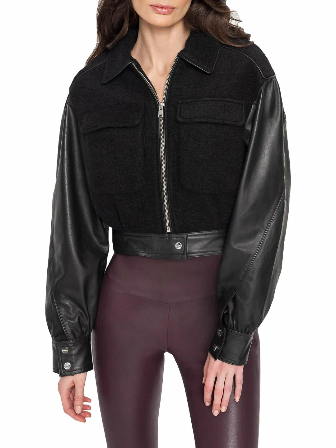 Rock your cold-weather wardrobe in the Dabria 21 mixed media bomber jacket by LAMARQUE. Made with wool, polyester & leather. This mixed media coat features a wool blend yoke and supple lamb leather sleeves. It’s cropped style will make it perfect for layering, with a zipper style.