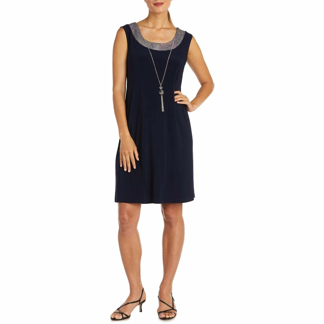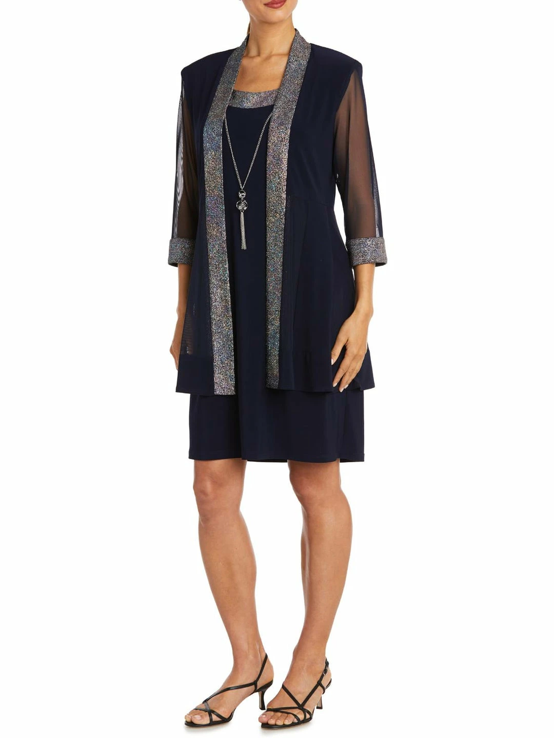 Make a statement in this dress and jacket set by R&M Richards. Made with polyester and spandex materials. This dress features a classic knee-length with metallic foil knit details. It features a sheer, open front matching jacket for lightweight coverage. Pair it with your favorite heels or dress sandals for that upcoming special occasion. Concealed back zipper closure. This set is guaranteed authentic.