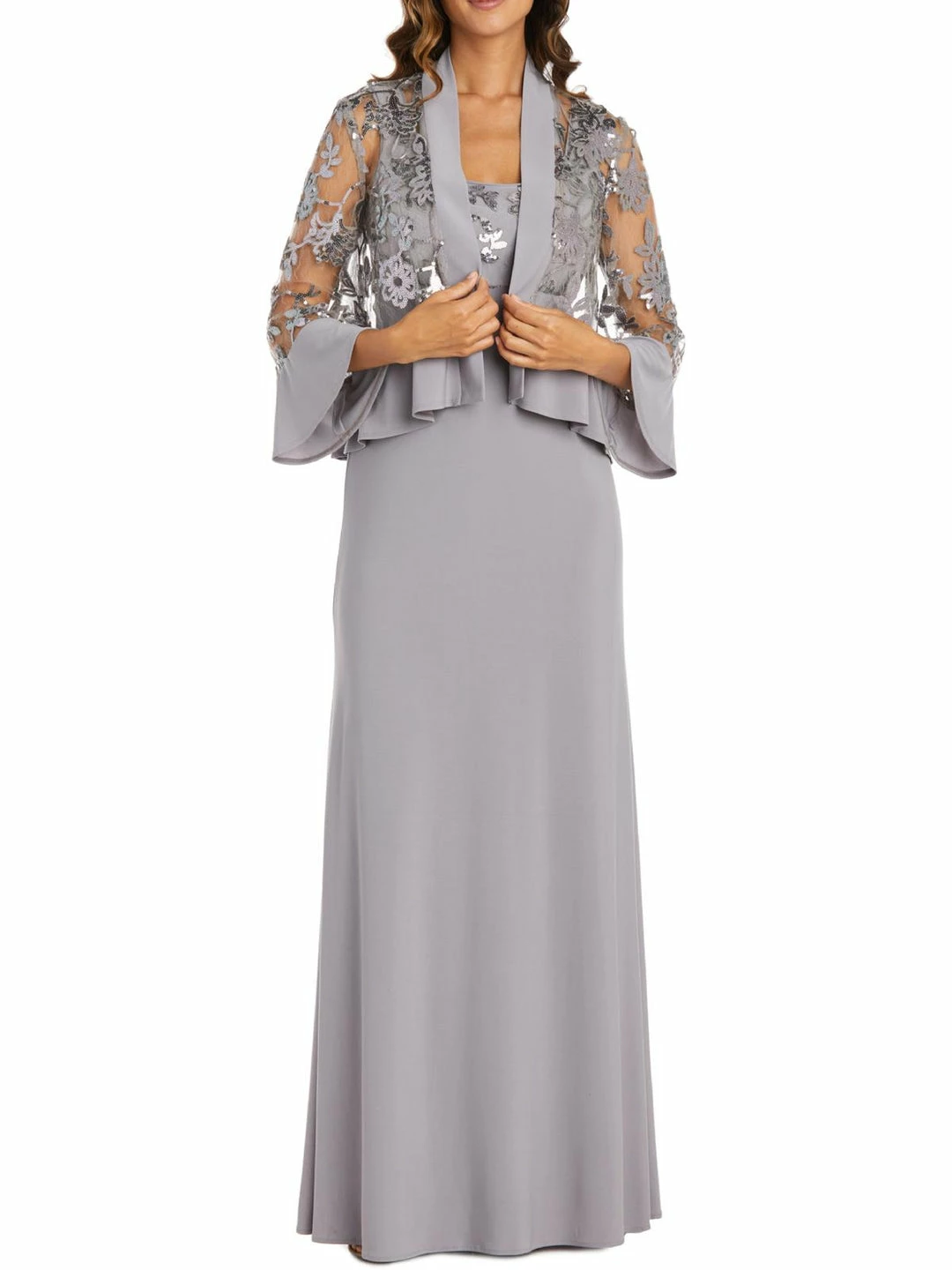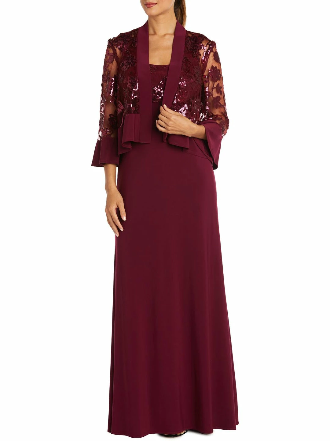 Dazzle on the big day in this dress and jacket set by R&M Richards. Made with polyester and spandex. This dress features ankle length cut with empire waist and sequined trim bodice. Set includes open front sheer jacket with graceful bell sleeves. Pair it with all your favorite heels to complete this photo ready look. Stunning lace inset details. Lined for convenience. Back zipper closure. This set is guaranteed authentic.