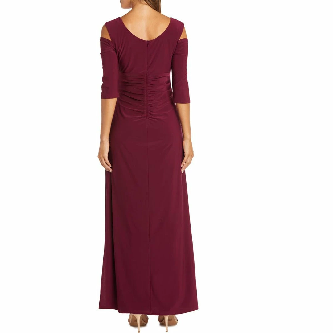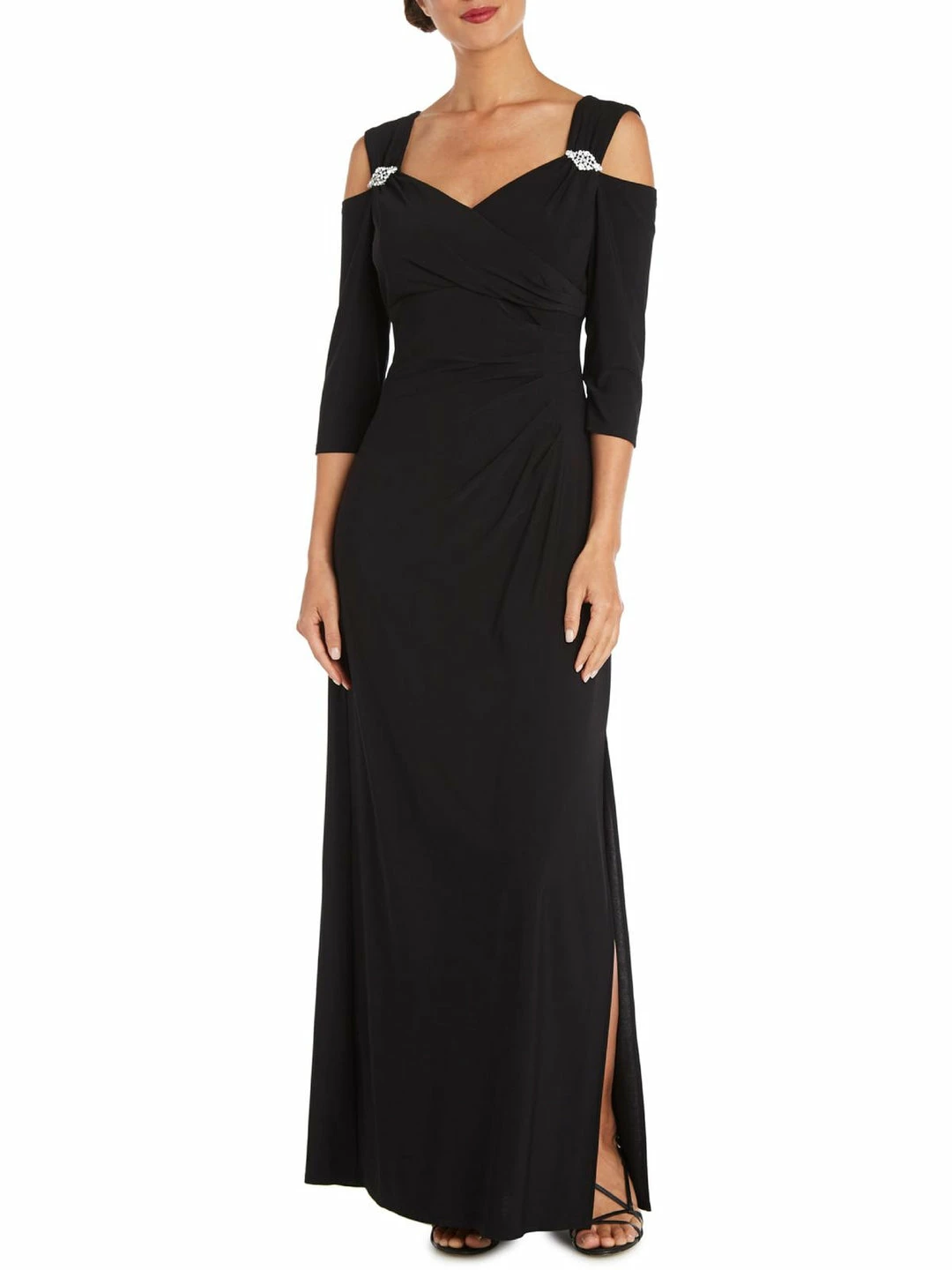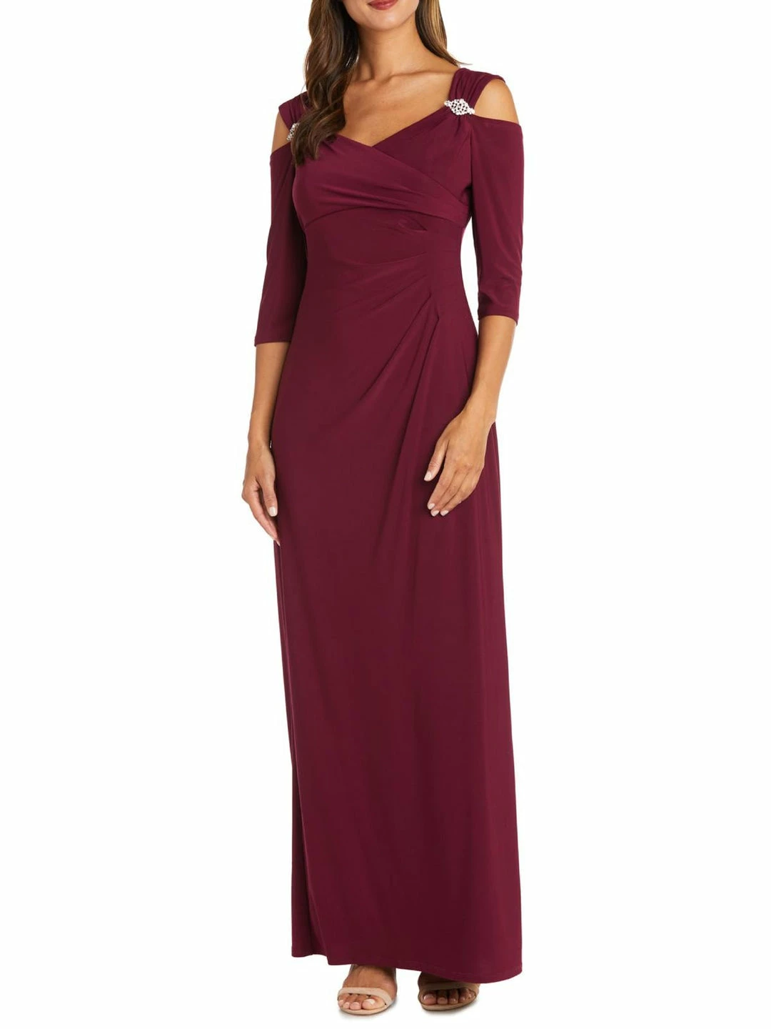 Be red carpet ready in this gathered off the shoulder gown by R&M Richards. Made with polyester and spandex. This full length design is adorned with diamante embellishments, gathered details, and an off the shoulder cut. Features a crossover neckline and back zipper. This dress is guaranteed authentic.