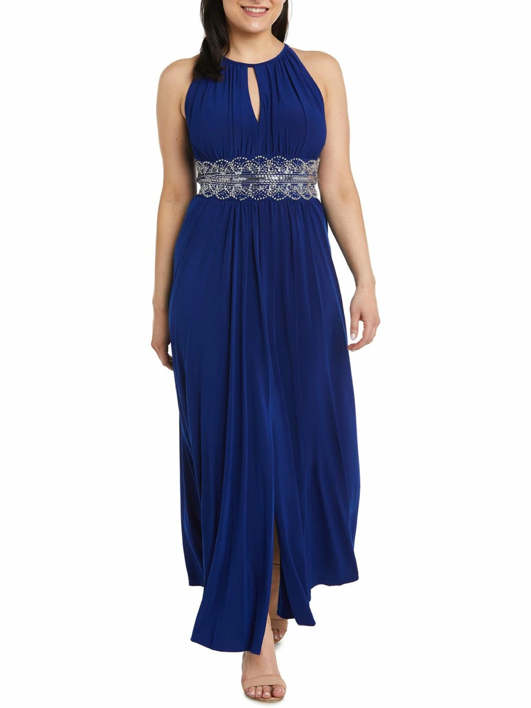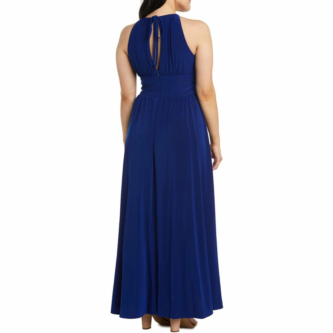 Feel effortlessly elegant in this gathered halter gown by R&M Richards. Made with 95% Polyester and 5% Spandex. This gown’s gathered details and shimmery waistline will accentuate your figure while delivering show stopping style. It features a sleeveless halter cut and a hidden back zipper. This dress is guaranteed authentic.