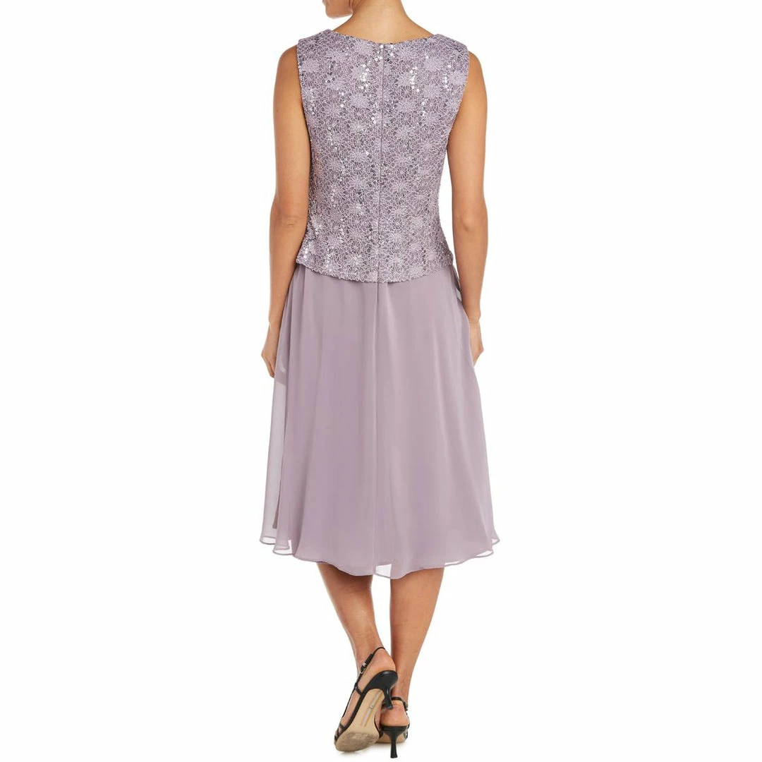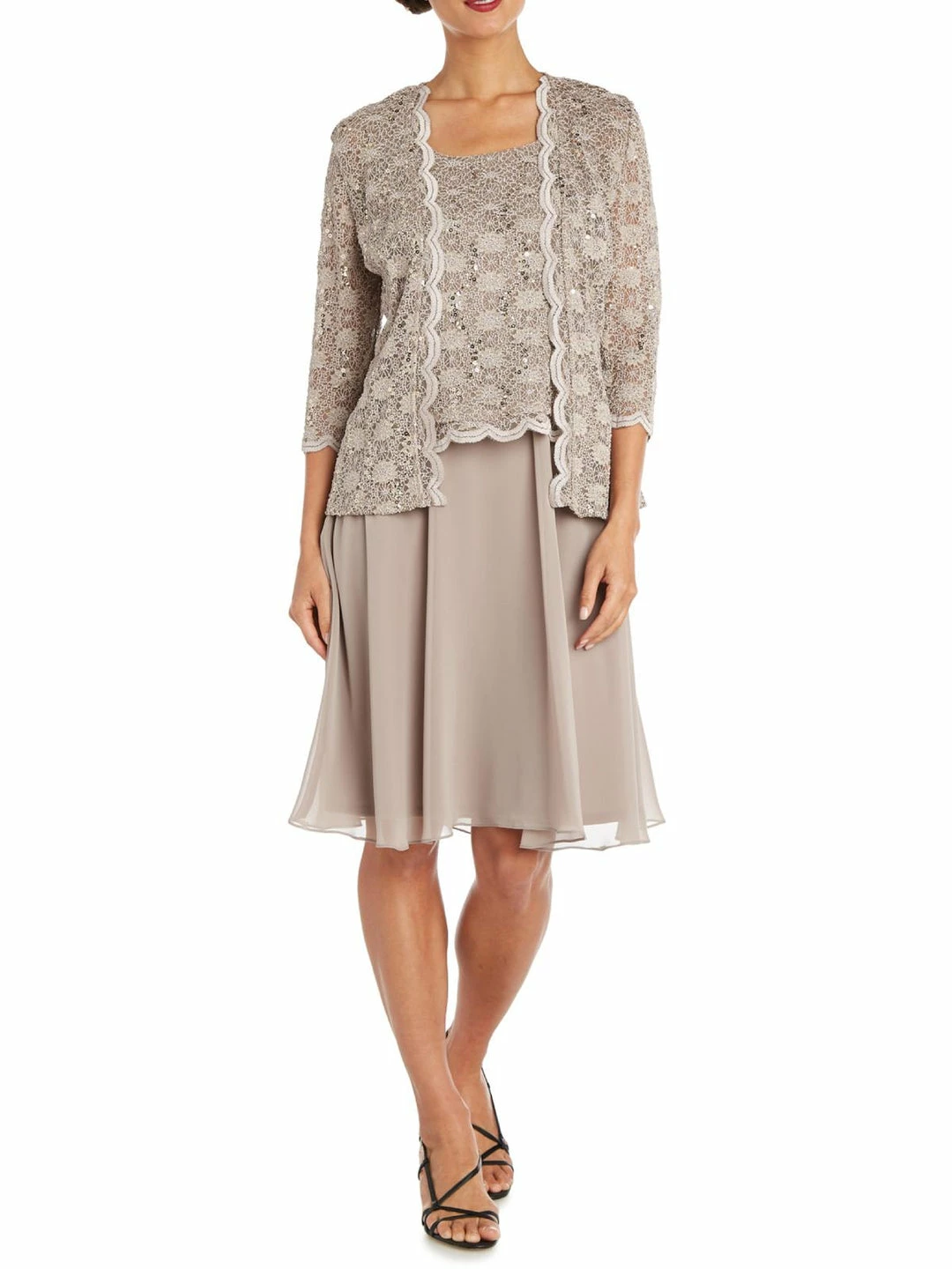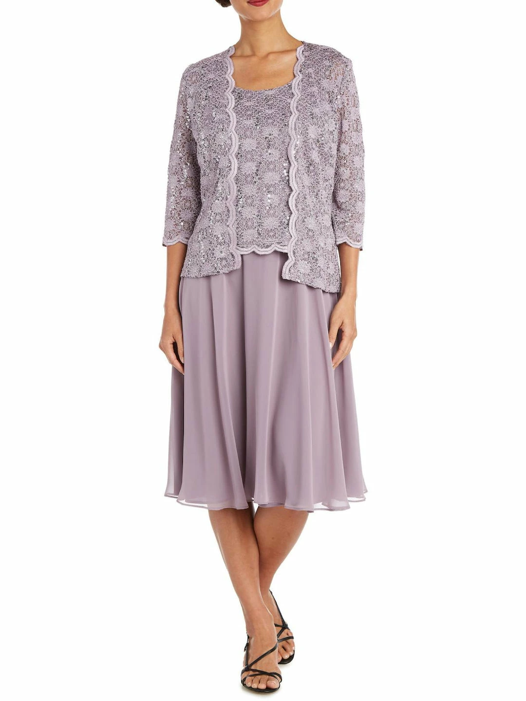 Dress up for the big day in this 2 piece dress and jacket set by R&M Richards. Made with 50% Polyester, 45% Nylon and 5% Spandex. This set is crafted with eye catching lace and scalloped details. Layer it up or down with the 3/4 sleeve jacket. Features a concealed back zipper. This dress is guaranteed authentic.