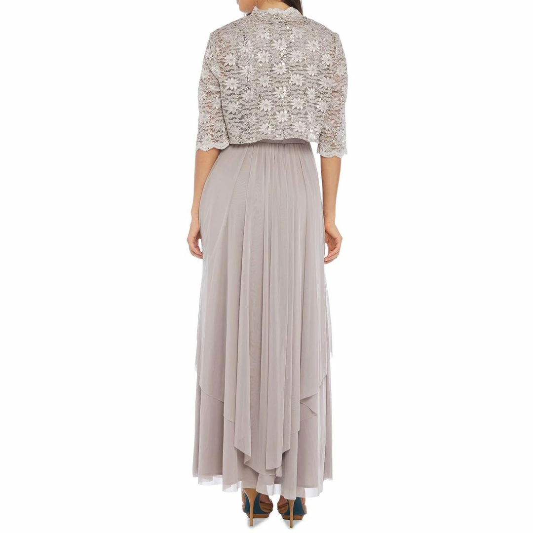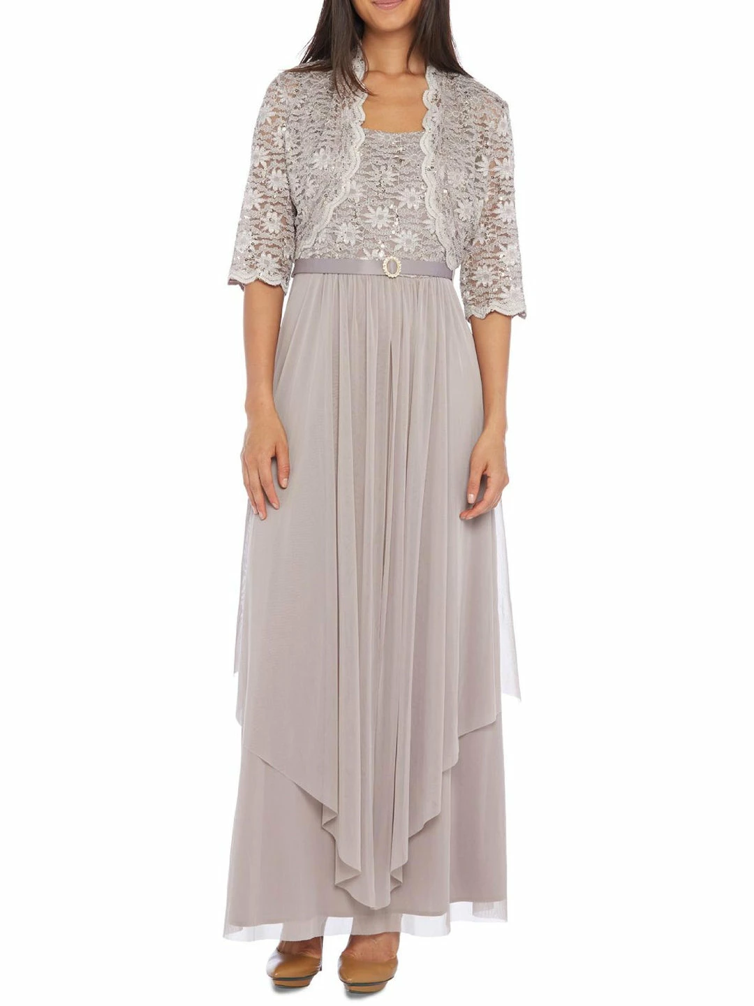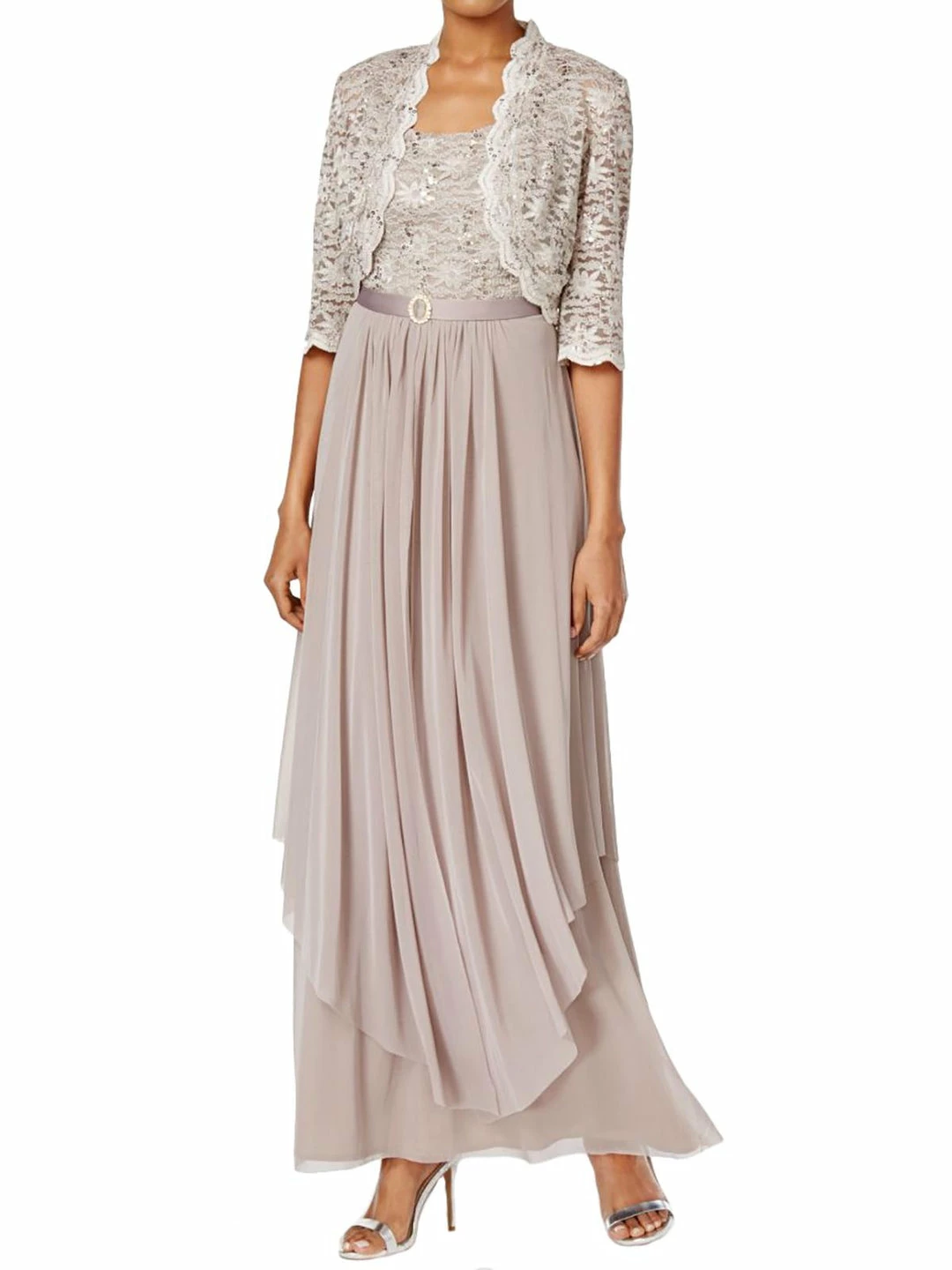 Be beautiful for the big day in this 2 piece mother of the bride dress and shrug set by R&M Richards. Made with 60% Nylon, 37% Polyester and 3% Spandex. This dress features a floral lace bodice, an A-Line tiered skirt, and a belted waist. Layer it up with the 3/4 sleeve shrug and a hidden back zipper. This dress is guaranteed authentic.