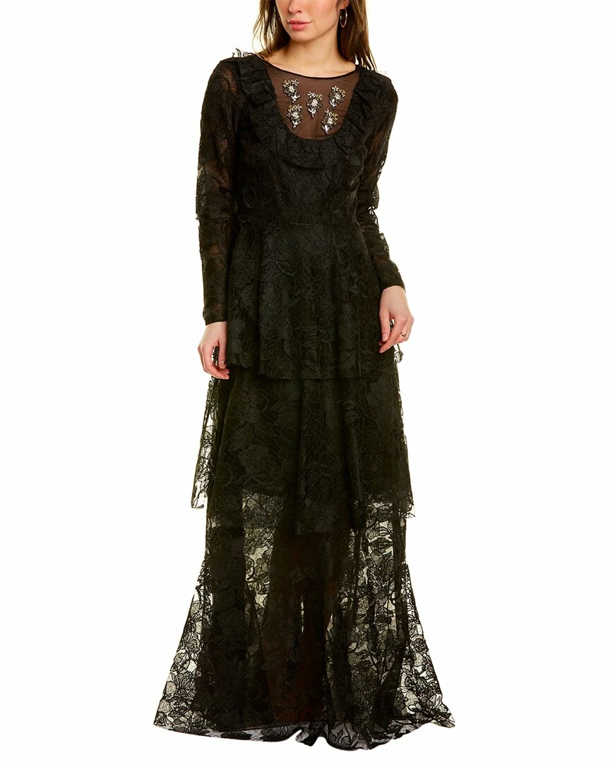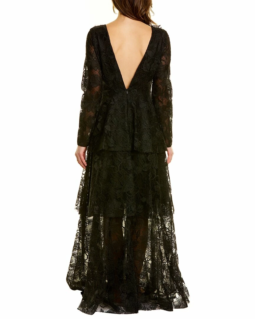 - Design Details – Bonded Lace Design, Sheer Neck Panel, Gemstone Accents, Back V, And Tiered Hem