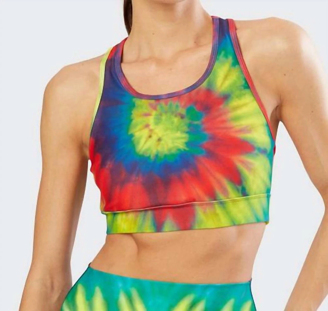 Medium support sports bra in vibrant tie dye with double layers, chafe-free seams, racerback and enhanced moisture-wicking fabric with quick-dry technology. BEST FOR – Running, yoga, CrossFit, barre, Pilates, spin class and gym workouts. 78% Polyester/ 22% Spandex MADE IN USA SUPPORT LEVEL – Moderate Model is 5’10†and wears a size small.