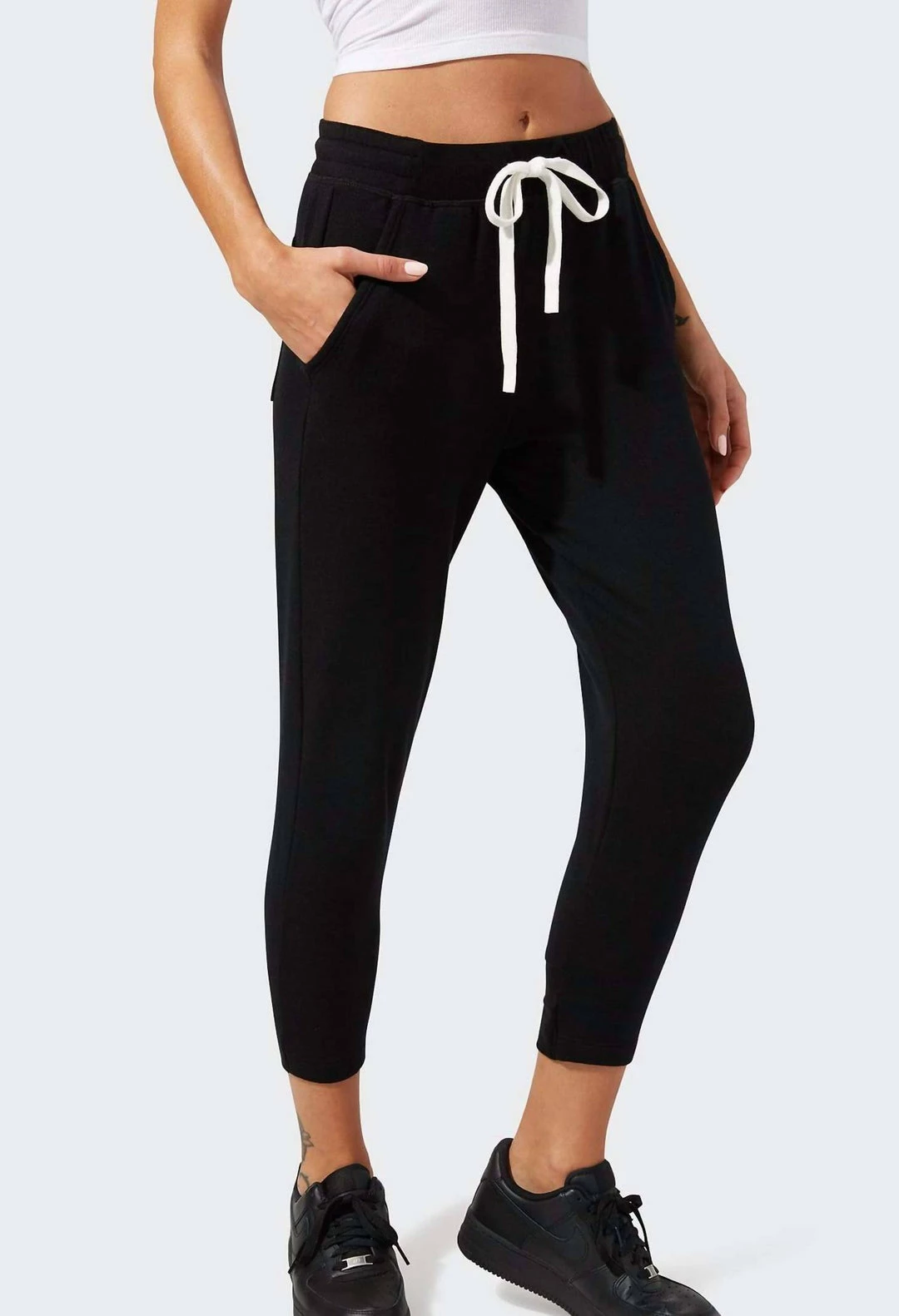 Relaxed fit sweatpant with cropped hem and elastic waist with drawcord. Made from super soft ultra luxe fleece for an effortless fit and pure comfort. Front side pockets and back hip pocket.Relaxed fit. True to size. Model is 5’10″ and wears a size small.