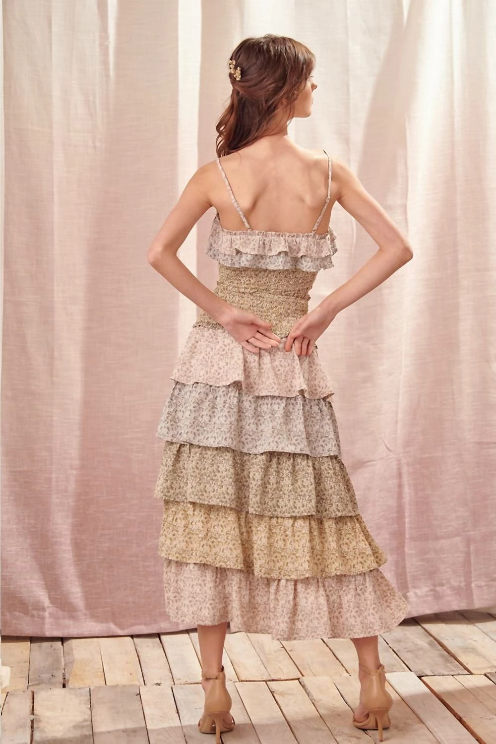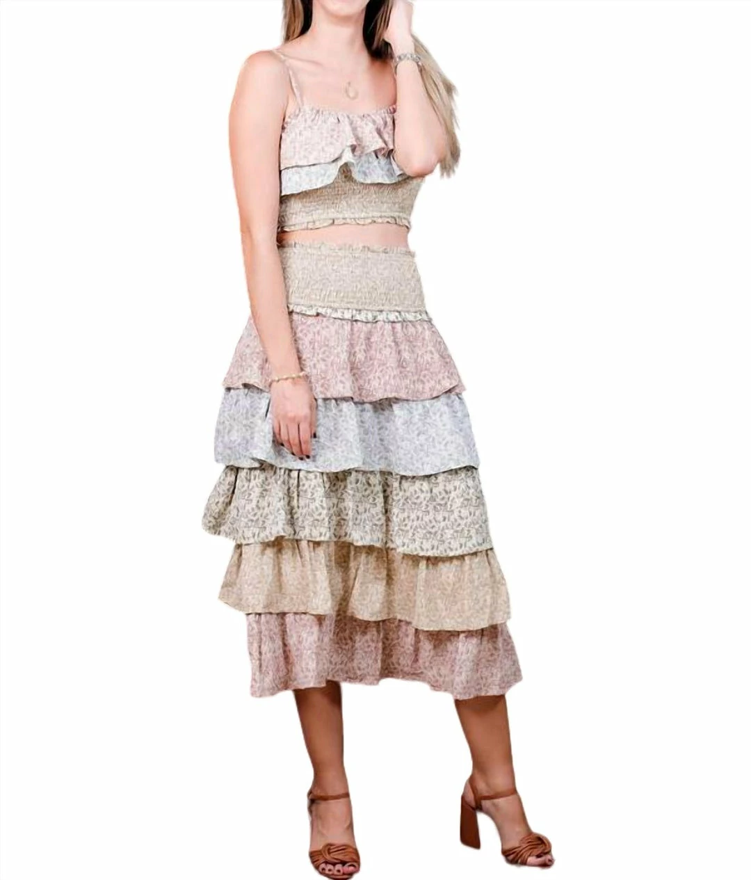 Tiered Ruffle Crop Top. It features a ruffled two-layer upper body, a smocked hem, and adjustable spaghetti straps.Color Block Layered Maxi Skirt In Floral Print It features a smocked waist with tiered ruffled layers.ÂÂ