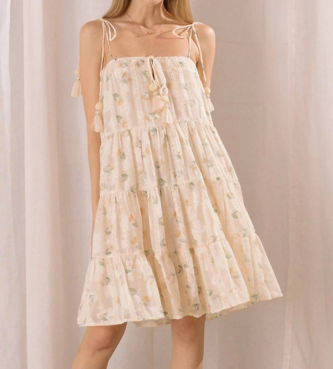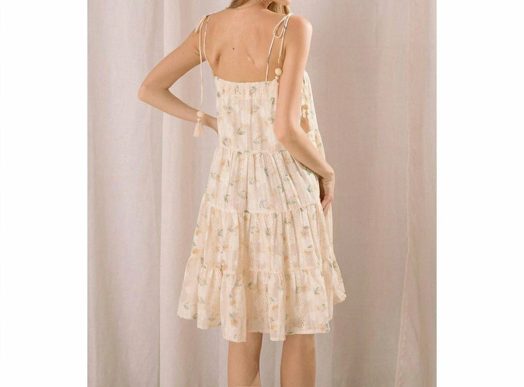 All-around smocked, straight neckline and a ruffled loose body. Center chest bow with tasseled ends and self-tie spaghetti straps with tasseled ends.