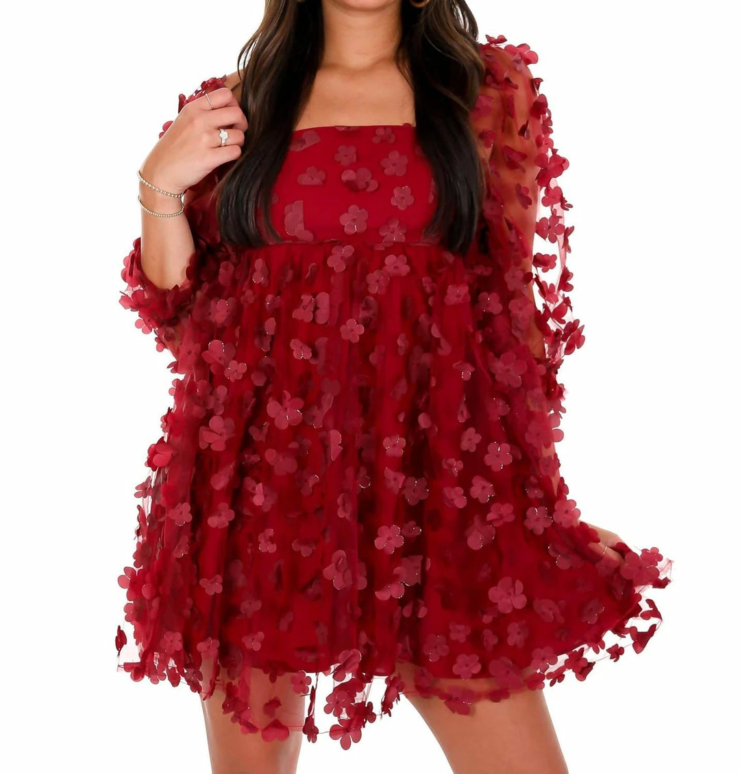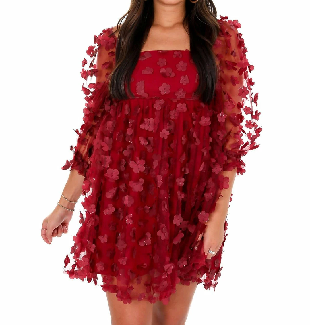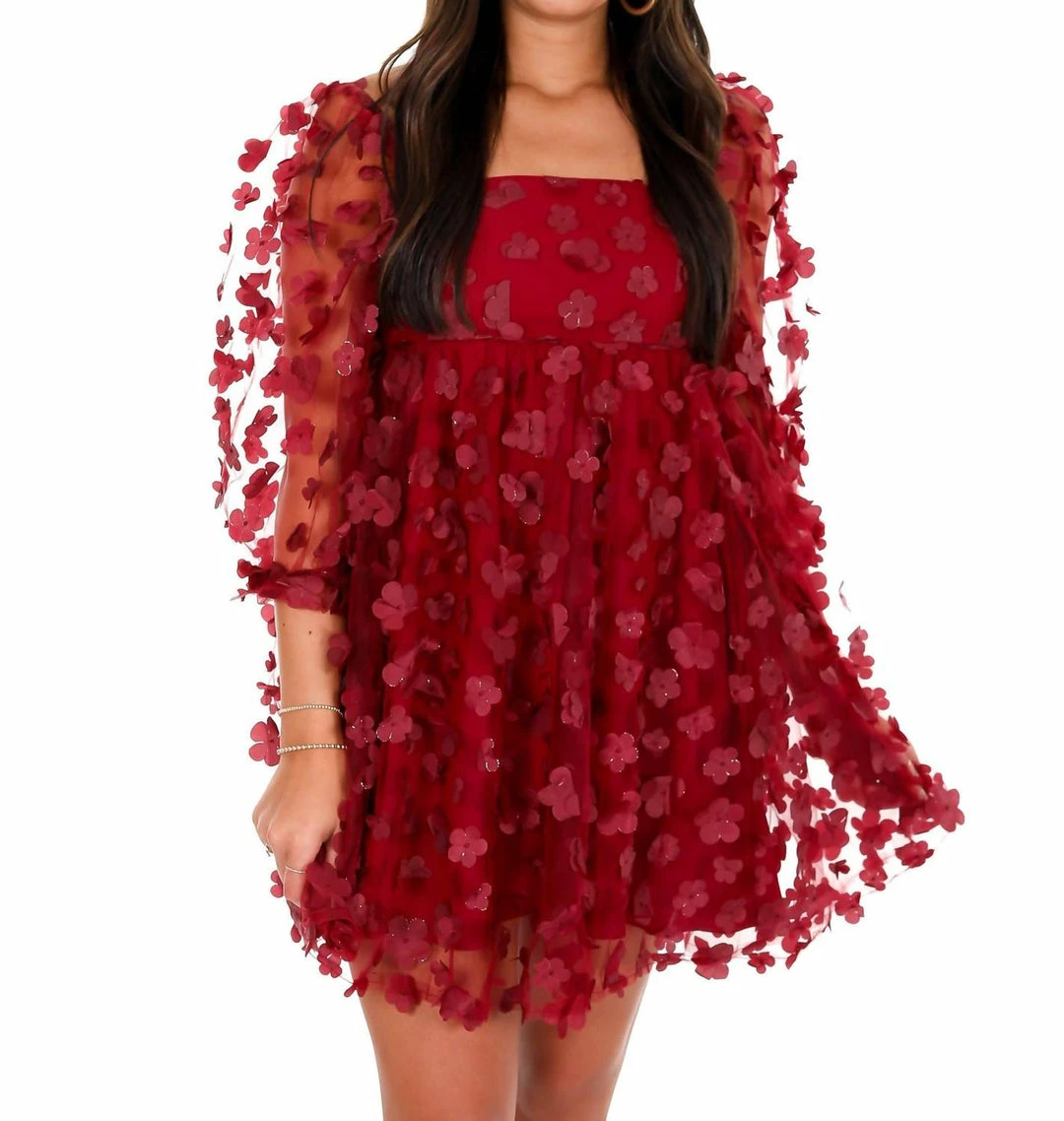 Babydoll mini dress3-D Metallic daisiesSquare necklineSemi sheer puff sleevesBack zipper closure