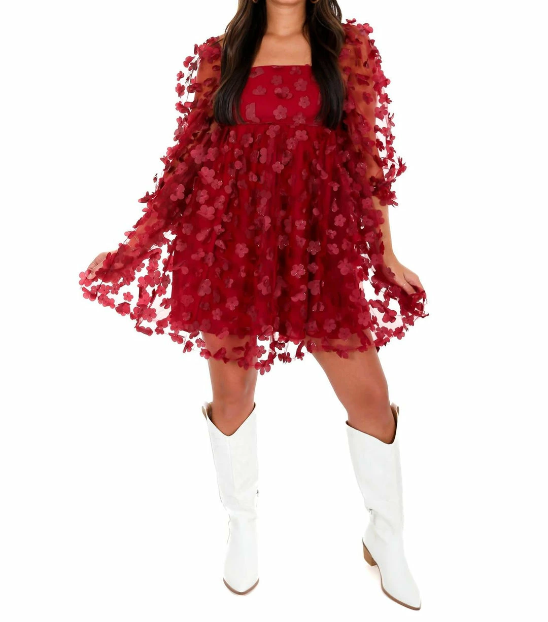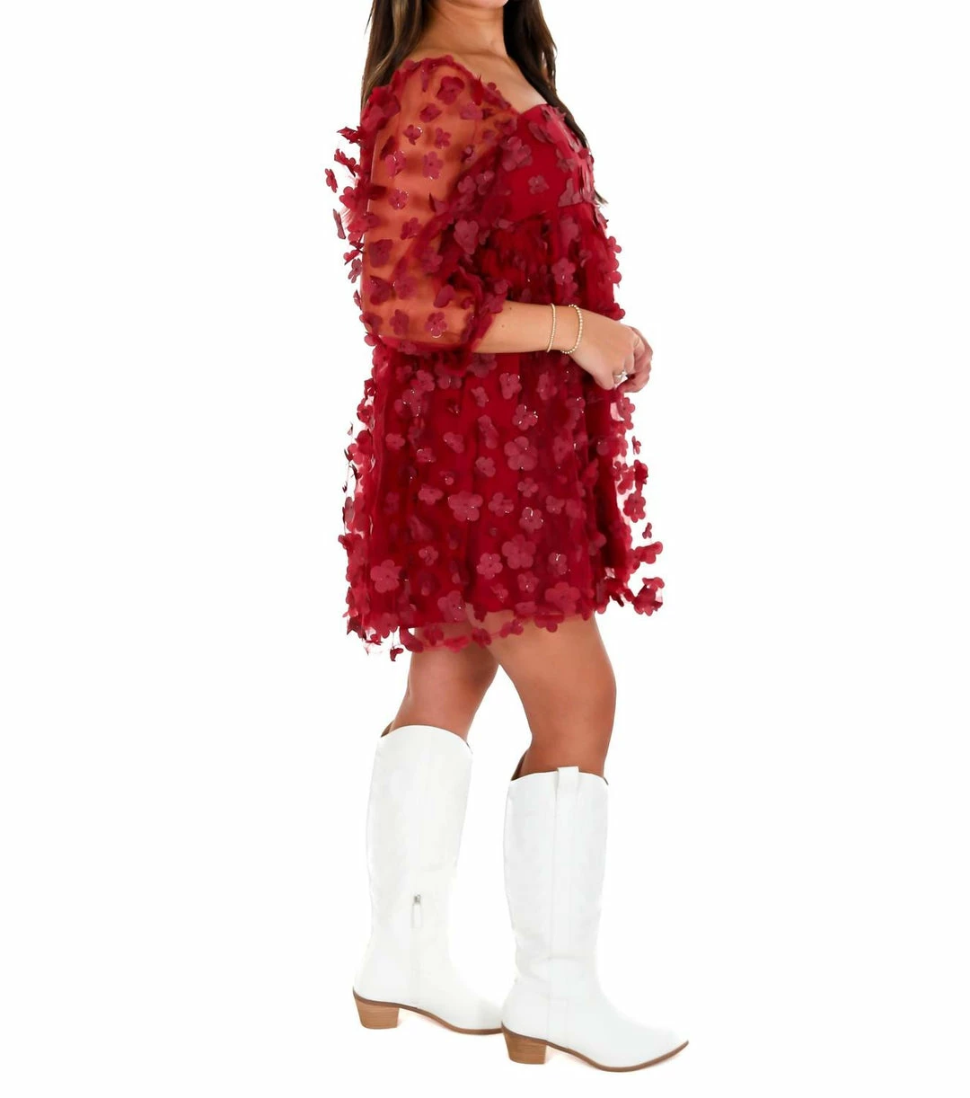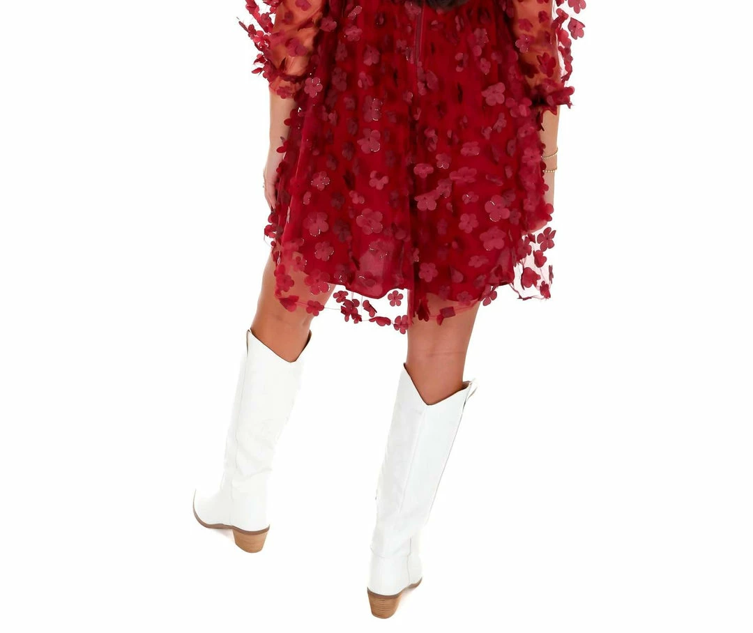 Babydoll mini dress3-D Metallic daisiesSquare necklineSemi sheer puff sleevesBack zipper closure