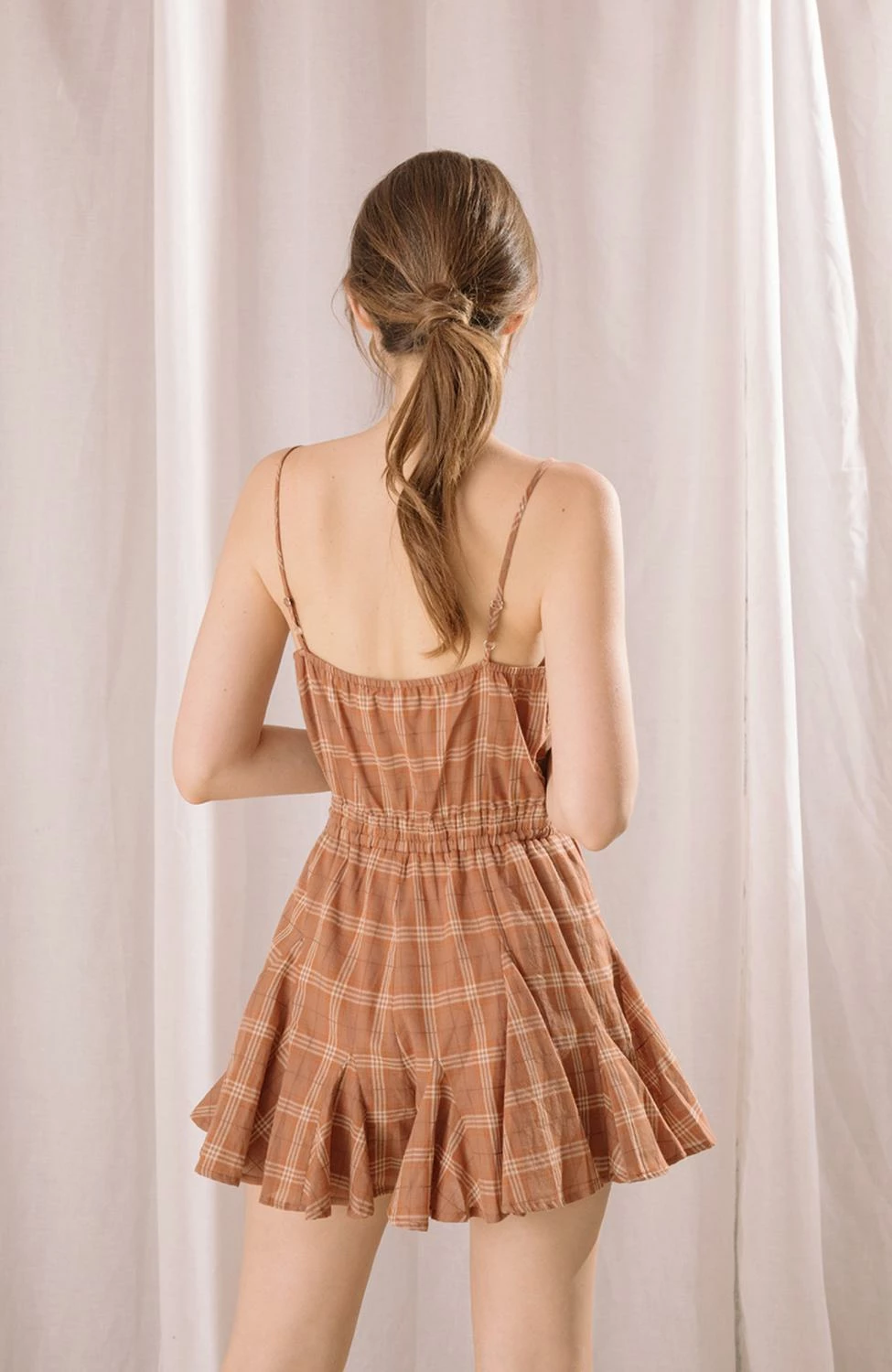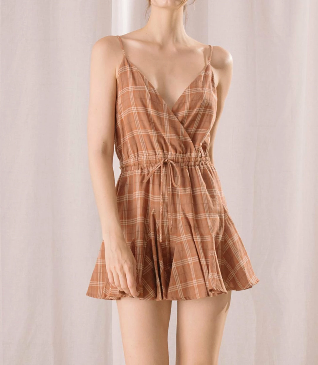 Storia Plaid Drawstring Waist Romper in Brown – women