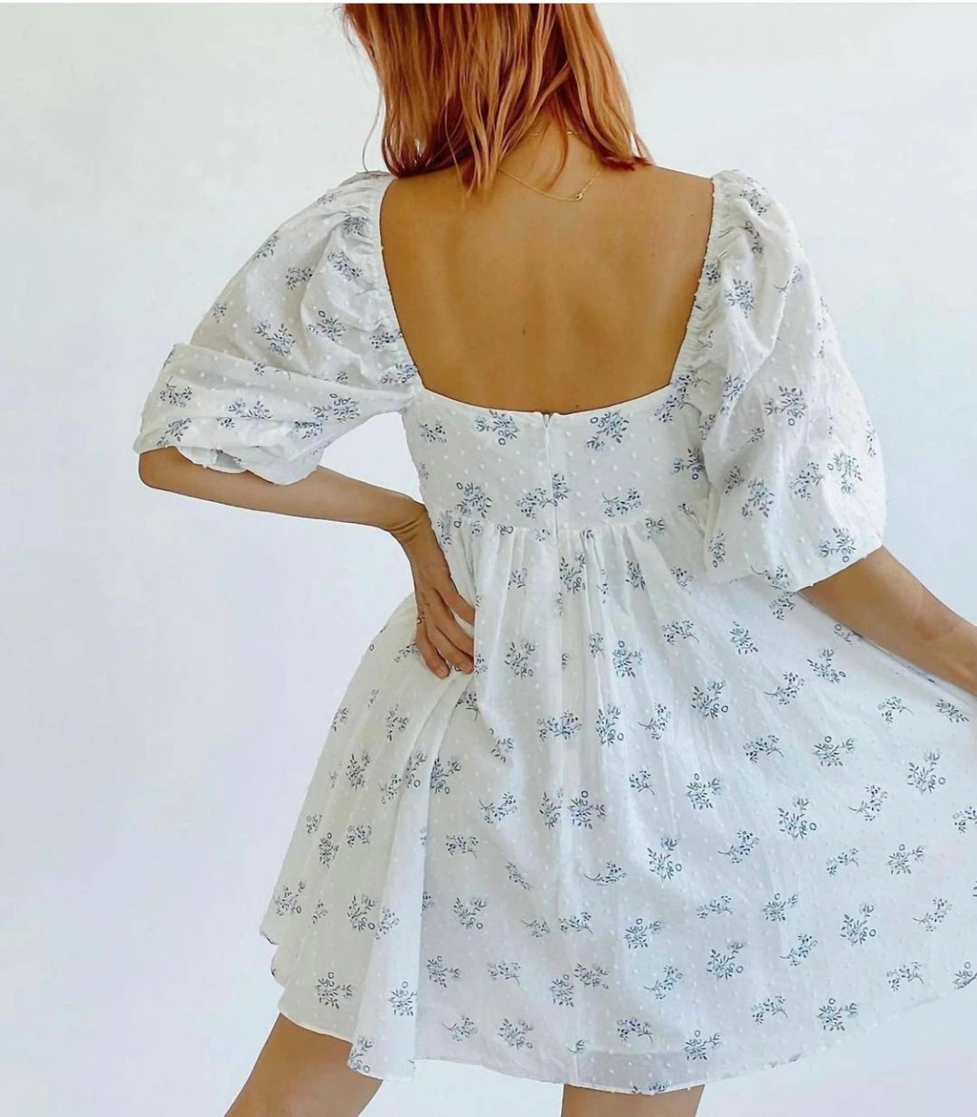Crisp white color features blue floral bouquet pattern and a front/back square neckline. Stand out in the 3/4 puffy sleeves with a ruffle trim cuff. Completed with a ruffled lower body and an invisible zipper. ImportedFits True to Size