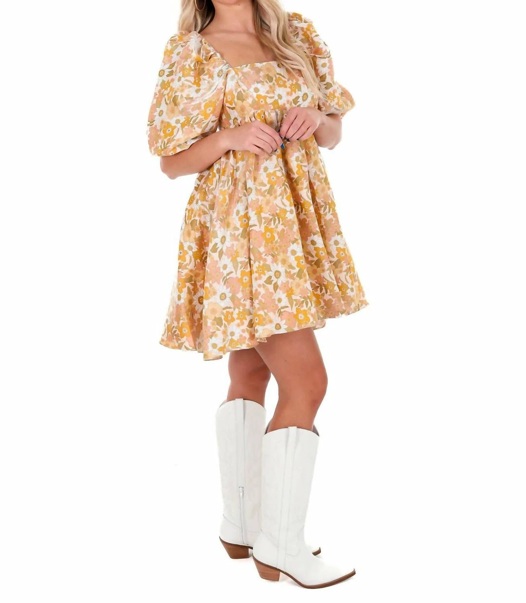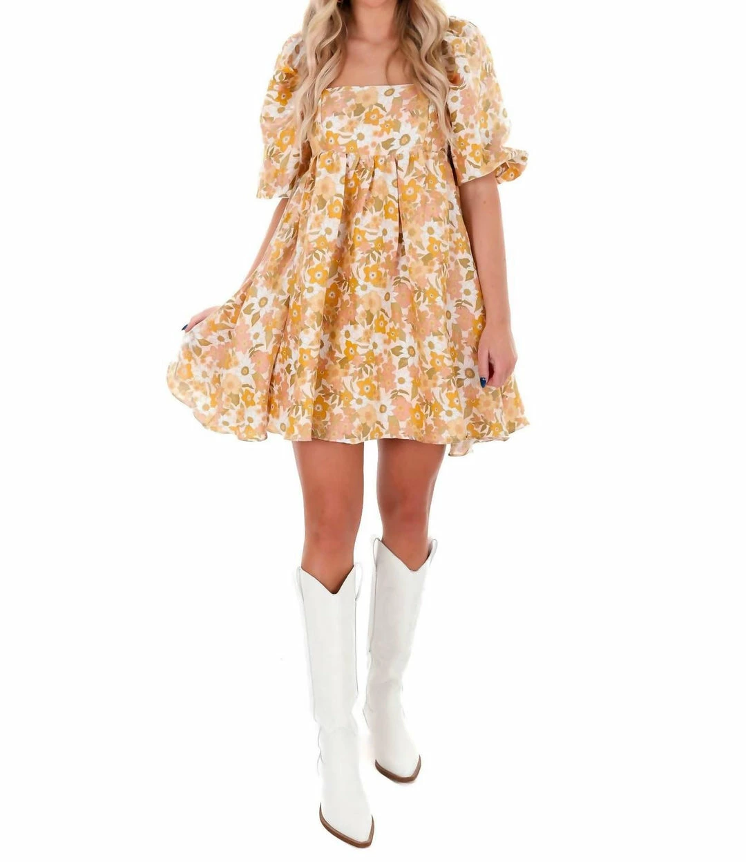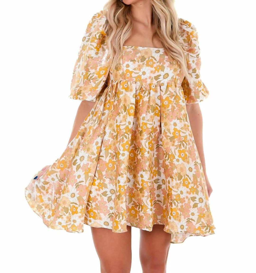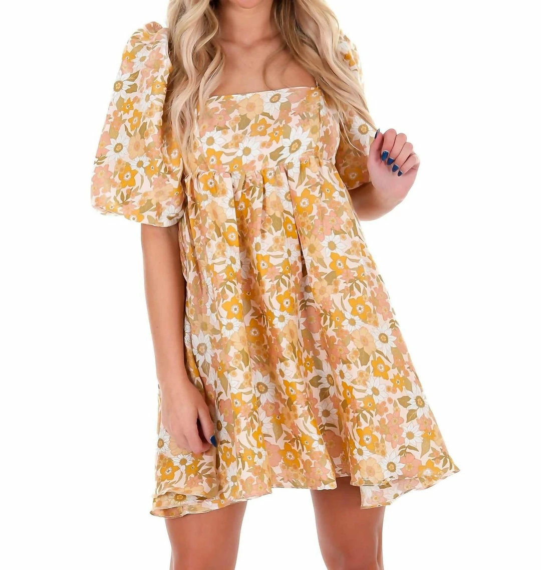 Floral babydoll dressSquare necklineOversized short puff sleevesInvisible back zipper