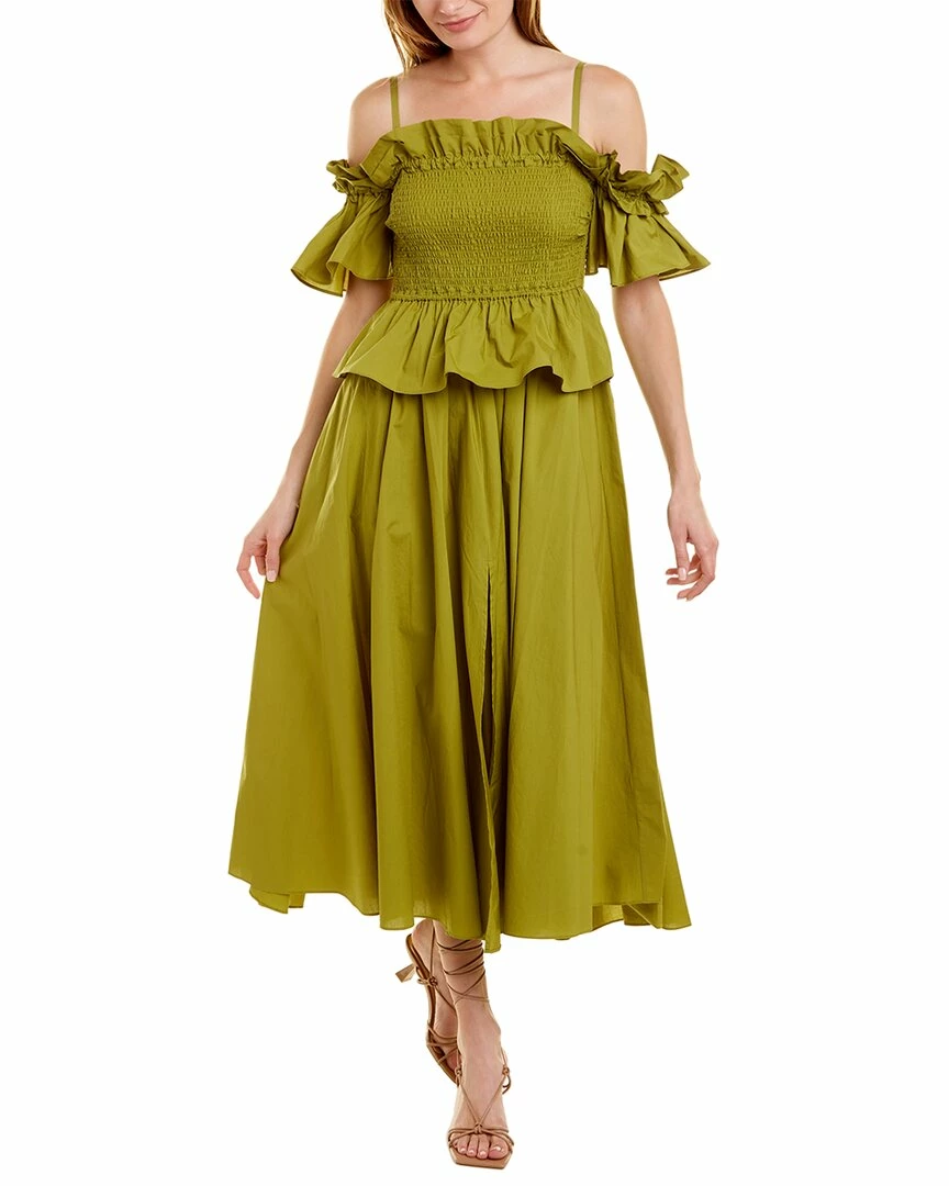 - Design Details – Elasticized Cold-Shoulder Style, Smocked Bodice, Ruffled Peplum Waist, And Vented Front Hem