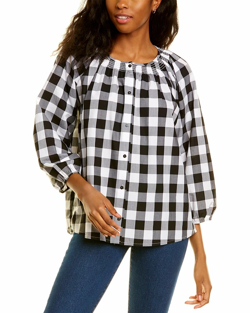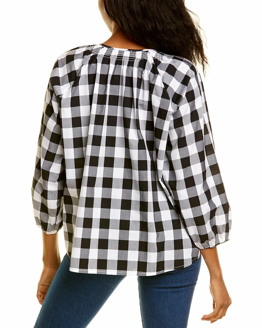 - Riley Gingham Top In Black With Smocked Neckline And 3/4-Length Sleeves With Elasticized Cuffs
