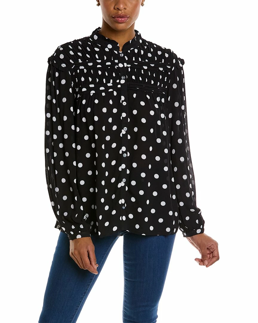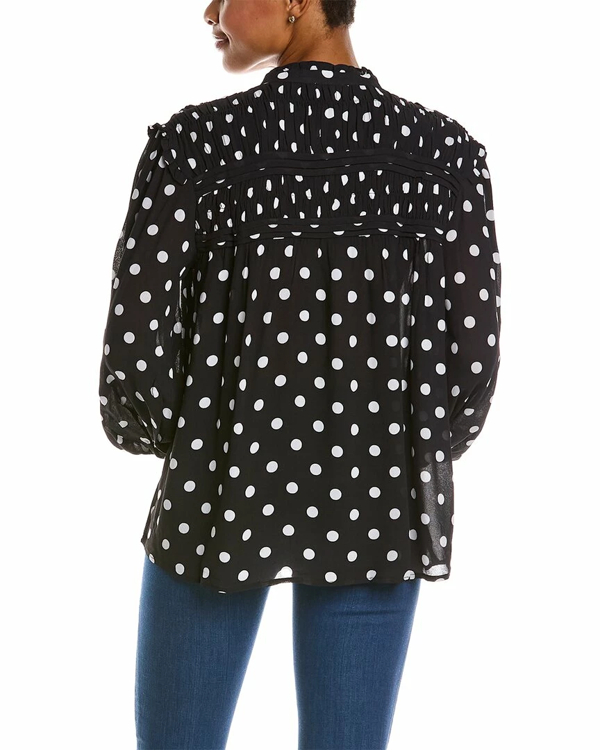 - Sara Dot Top In Black With Smocked Detailing, Pleated Trim And Button Cuffs